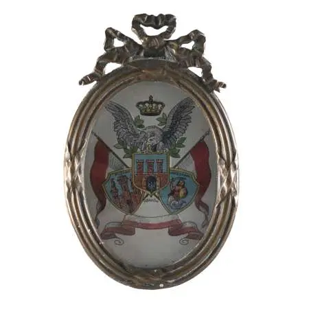 Brosza patriotyczna, dwuczęściowa z nałożoną tarczą trójpolową z koroną, herby: Polski, Litwy i Rusi