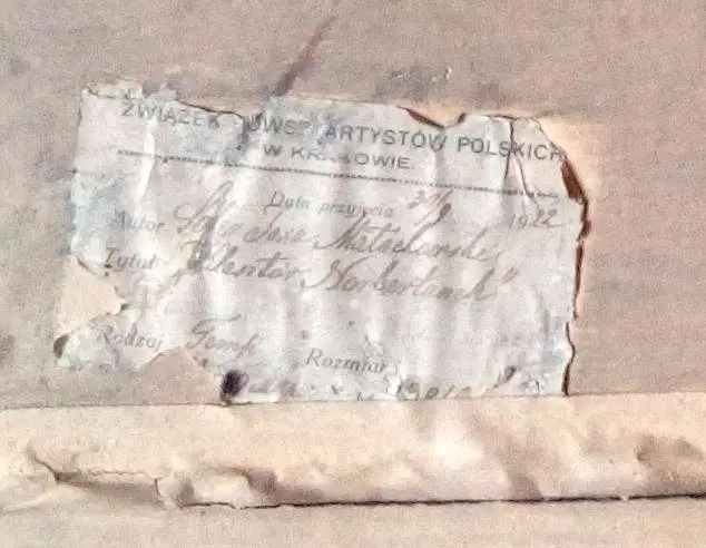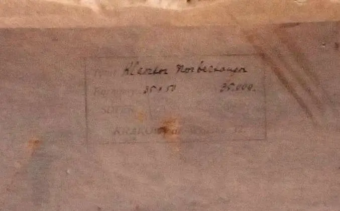 Na odwrocie nalepka Związku Artystów Plastyków w Krakowie wypełniona odręcznie atramentem, z opisem pracy. Dodatkowo pieczątka autorska z opisem pracy oraz adresem pracowni.