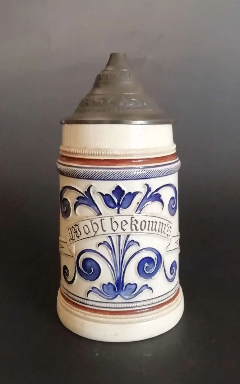 Kufel ceramiczny z pokrywą cynową, wys. 21 cm. Niemcy, stan zachowania bardzo dobry.