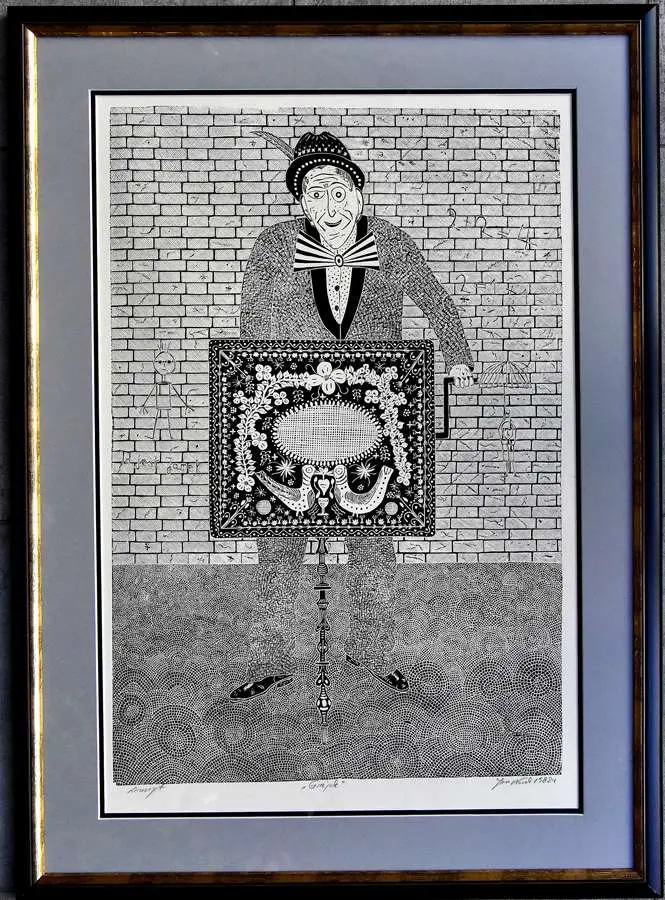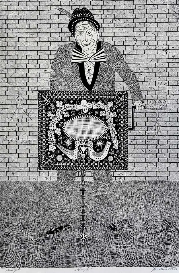 linoryt, odbitka wykonana ręcznie bez użycia prasy graficznej, 60,7 x 42,3 cm, sygn. oł. p.d.: Jan Nowak 1982 r.; oł. l.d.: Linoryt „Grajek”, monogramem na płycie p.d.: JN 1982. Odbitkę prezentowanej grafiki posiada w swoich zbiorach Muzeum Śląskie w Katowicach.