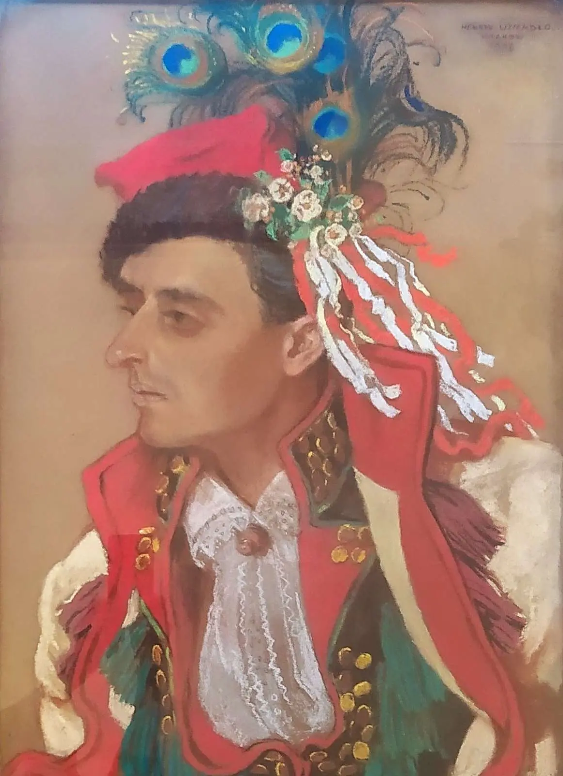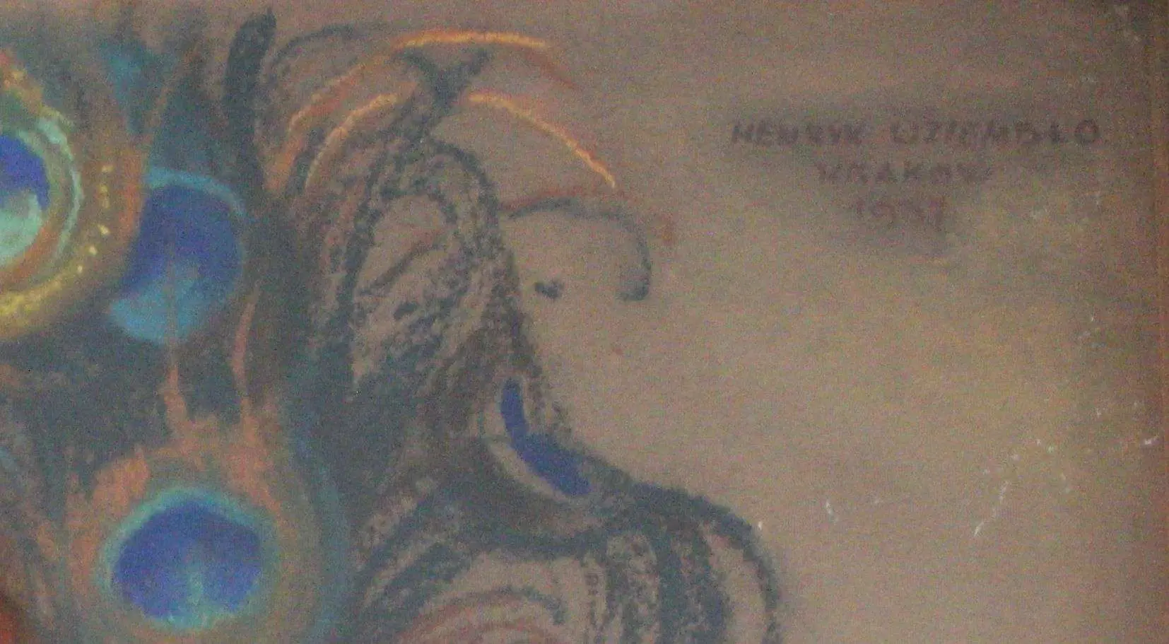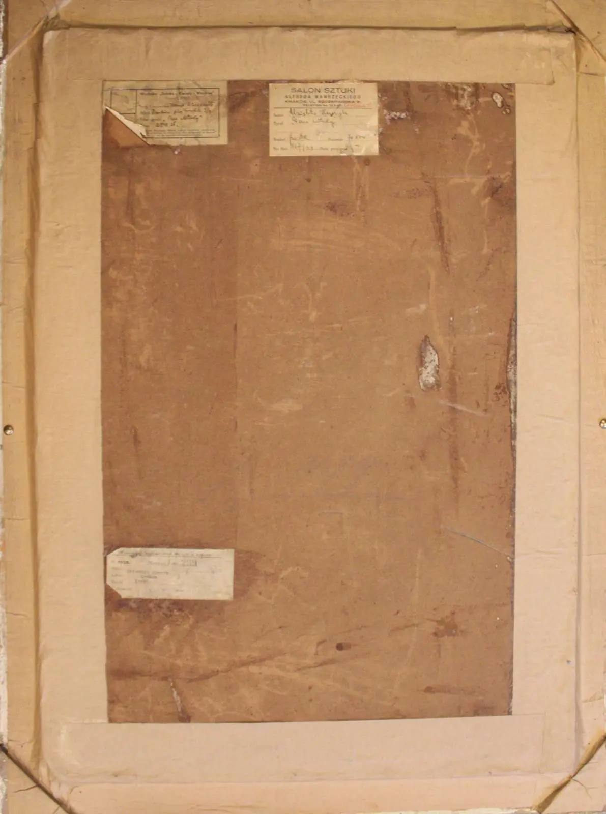 Pastel, papier, wym. 70 x 50 cm, sygn. p.g, dat. 1937. Na odwrocie nalepki Salonu Sztuki Alfreda Wawrzeckiego z Krakowa, wystawy "Sztuka - Kwiaty-Wnętrze" organizowanej w Poznaniu w roku 1937 oraz nalepka Towarzystwa Przyjaciół Sztuk Pięknych w Krakowie.