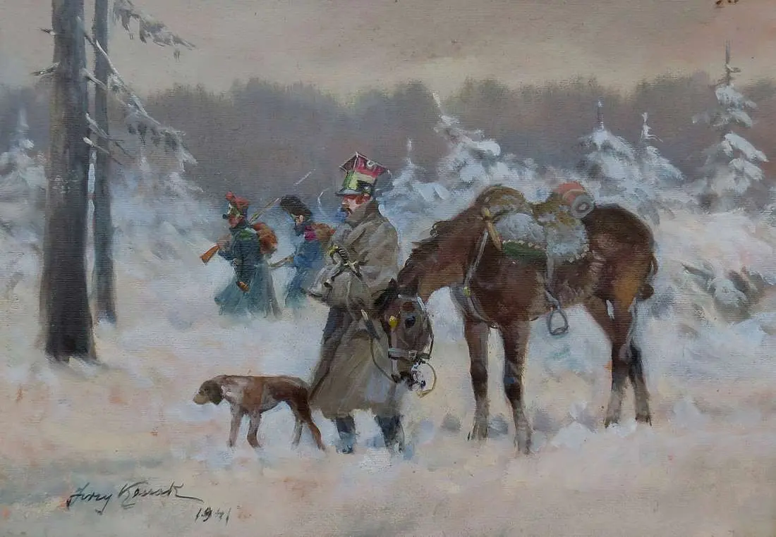 olej, tektura, 35 x 49,5 cm, sygn. l. d.: Jerzy Kossak / 1941 Na odwrocie okrągła pieczęć: „Jerzy Kossak Kraków Plac Kossaka 4”, oraz pieczątka z autorskim napisem: „Stwierdzam autentycz- /ność tego obrazu / Jerzy Kossak”.