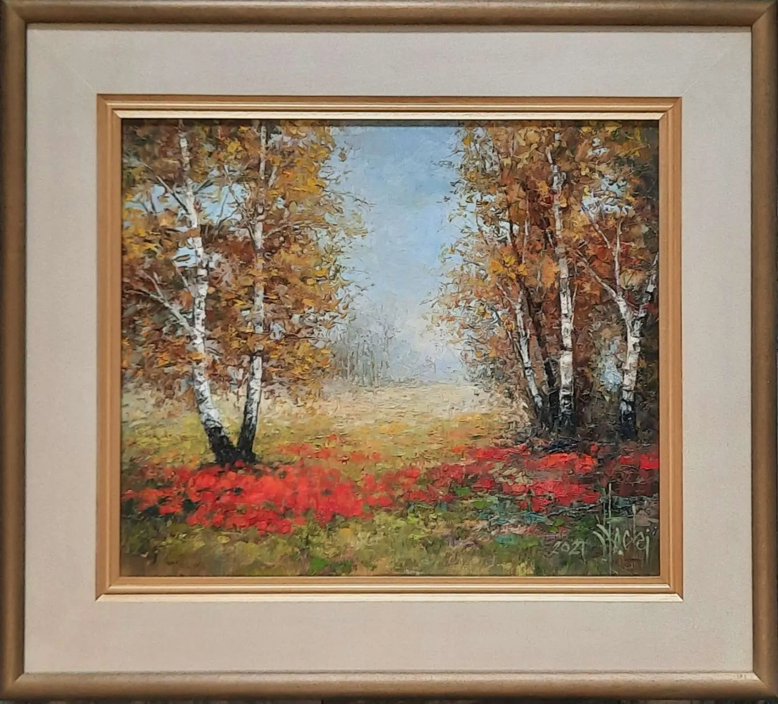 olej / płótno, wym. 38 cm x 46 cm, sygn. p.d. J. Łącki, datowany 2021; oprawa autorska - drewniana, malowana