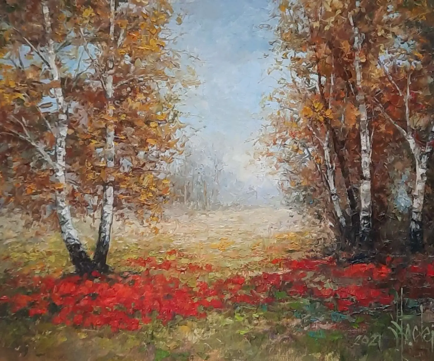 Brzozy i kwiaty