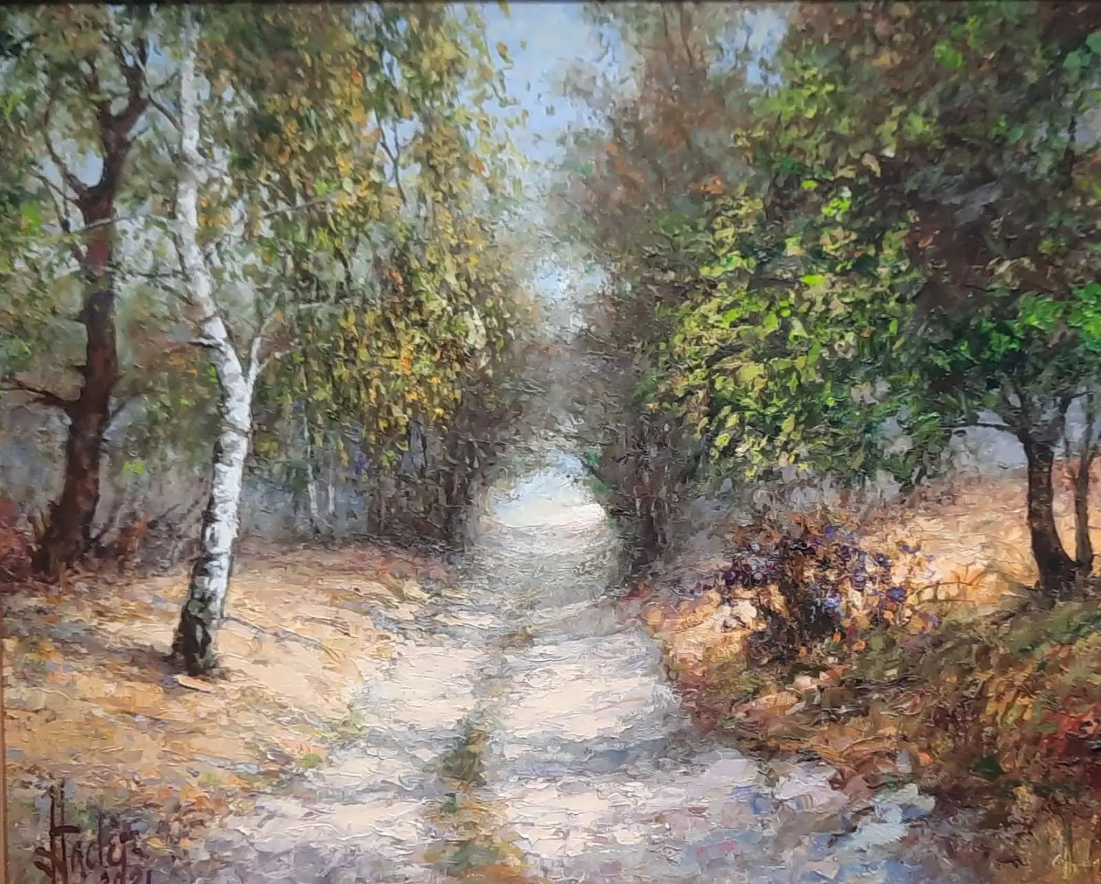 olej / płótno, wym. 50 cm x 61 cm, sygn. l.d. J. Łącki, datowany 2021; oprawa autorska - drewniana, malowana.
