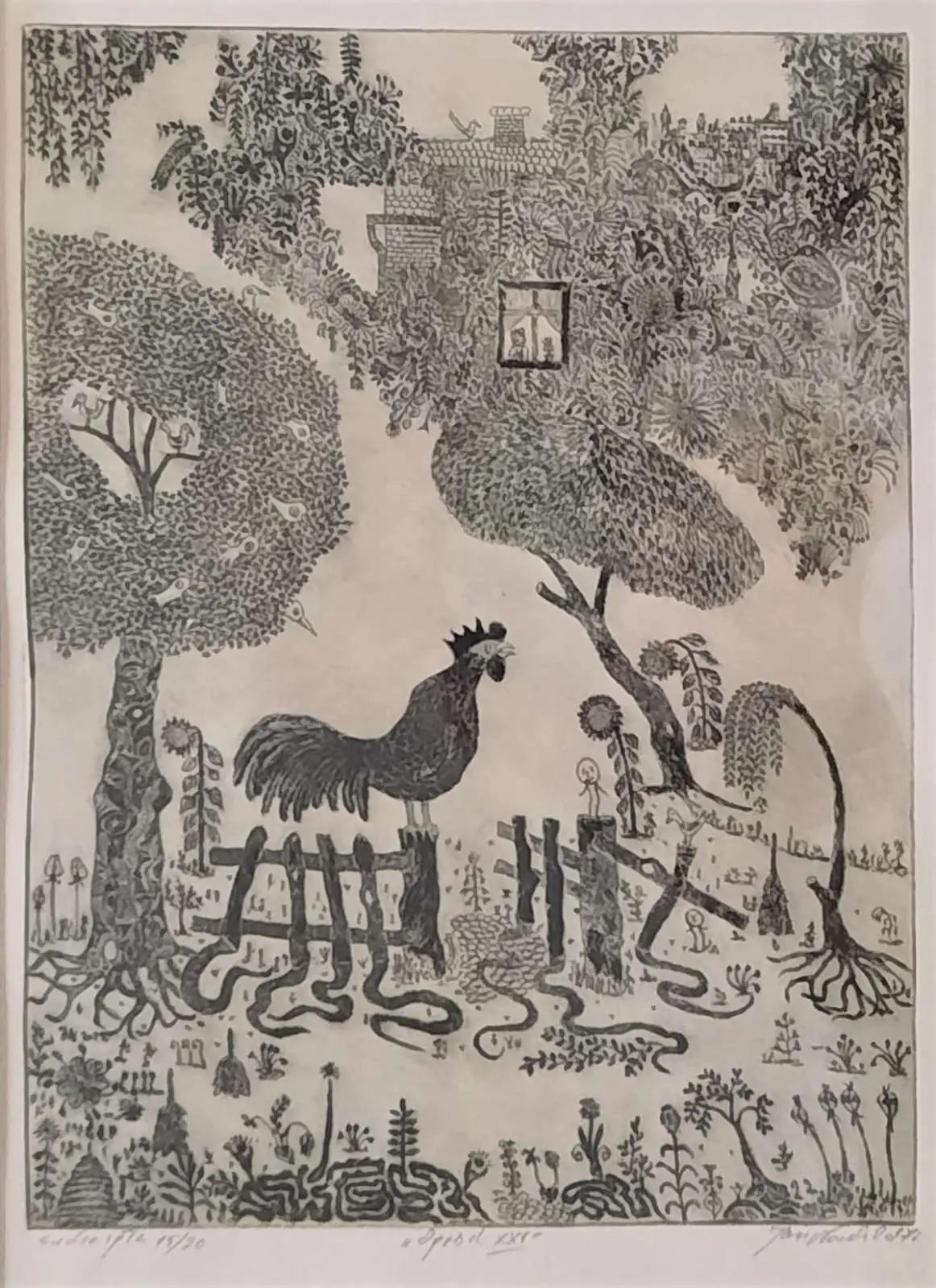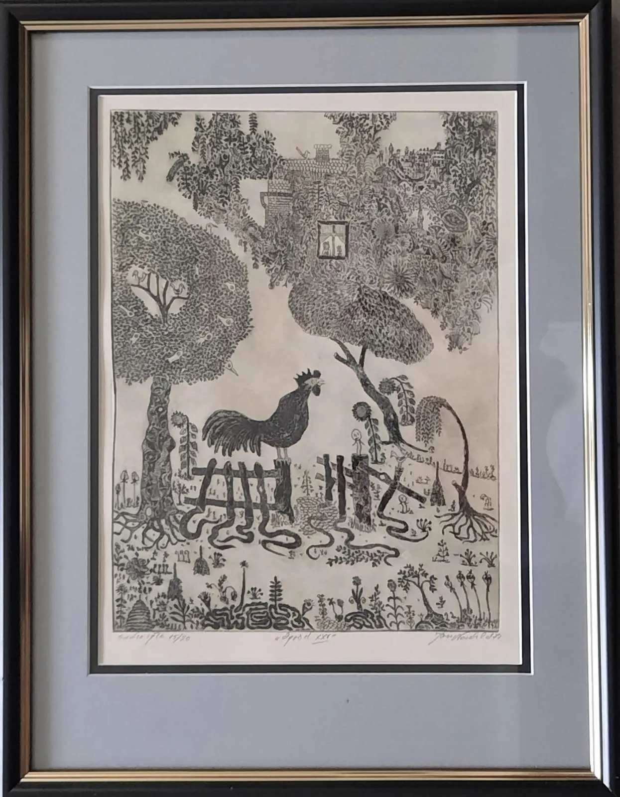 sucha igła / papier, wym. 28,5 cm x 21 cm, sygn. oł. p.d.: Jan Nowak 2017 r.; oł. l.d.: sucha igła 15/20, oł. śr.d. „Ogród XXV”; oprawa listwowa, szklenie