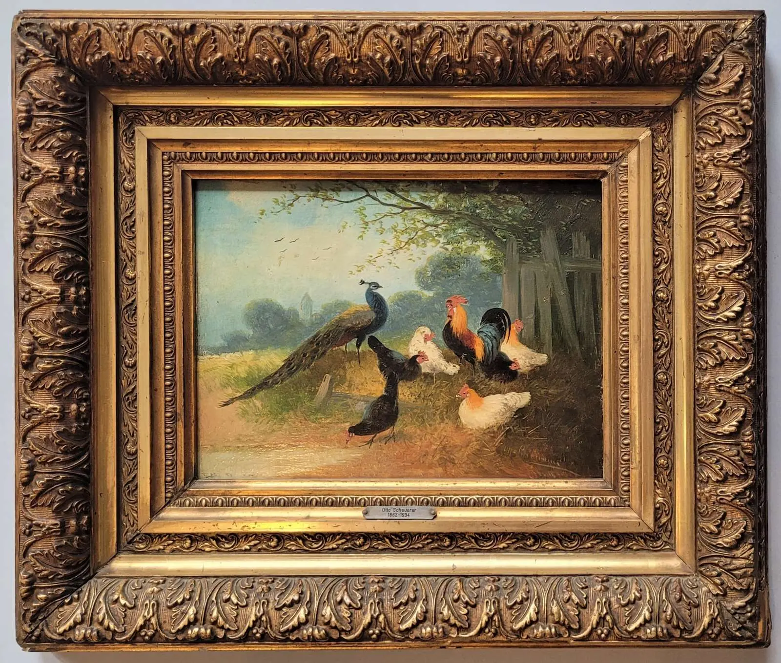 olej, deska, wym. 17 cm x 23 cm, sygn. p.d. "Otto Scheuerer", oprawa drewniana, z gipsowymi aplikacjami, złocona, w dolnej części oprawy tabliczka z wygrawerowanym imieniem, nazwiskiem oraz datami życia autora.