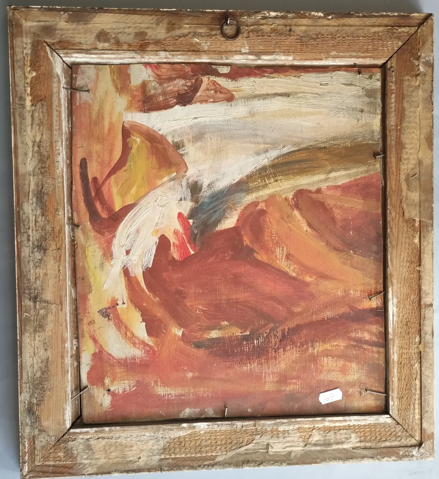 olej / sklejka , wym. 35,50 cm x 31,50 cm, sygnatura nieczytelna, sygn. l.d.: Zakrzewsk(...) / obraz przypisywany Janinie  Maliszewskiej - Zakrzewskiej; stan zachowania - ubytki  w p.g. rogu pracy; oprawa drewniana, malowana na biało - ubytki w ramie; na odwrocie fragment kompozycji
