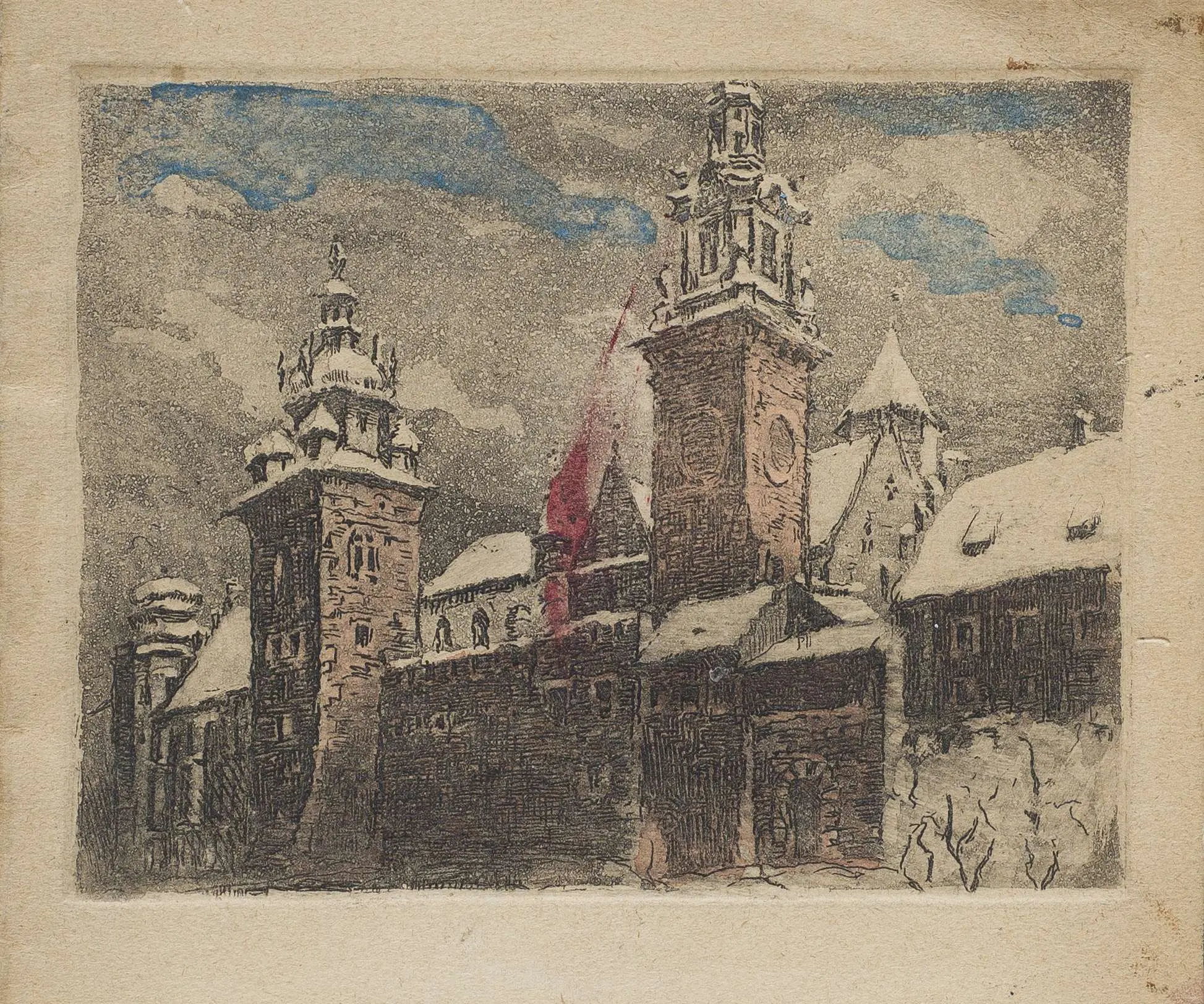 Akwaforta, akwatinta podmalowana akwarelą, 8 x 10,5 cm (odcisk), 10 x 12(24) cm (karton złożony wzdłuż na pół w formie zaproszenia), niesygn.