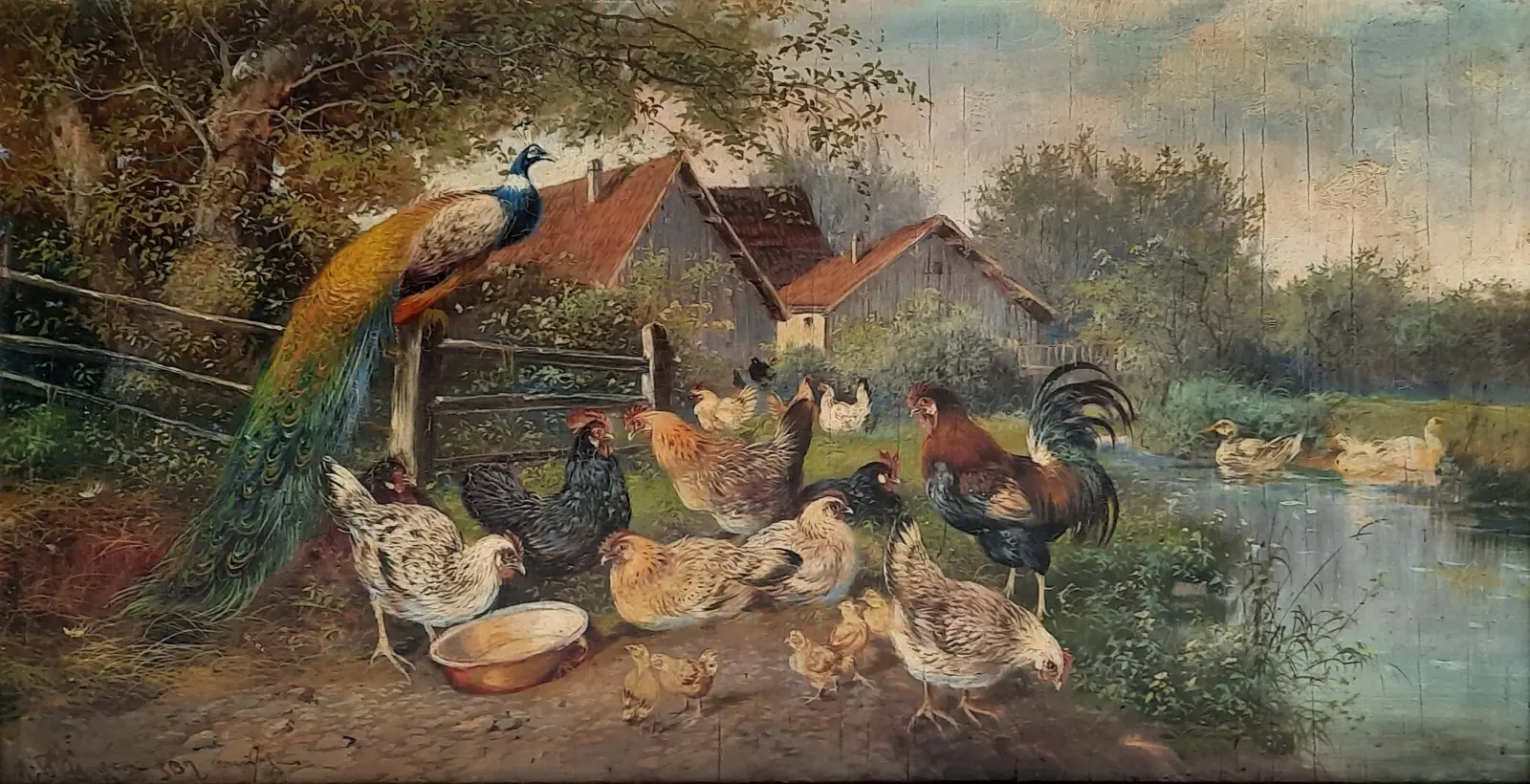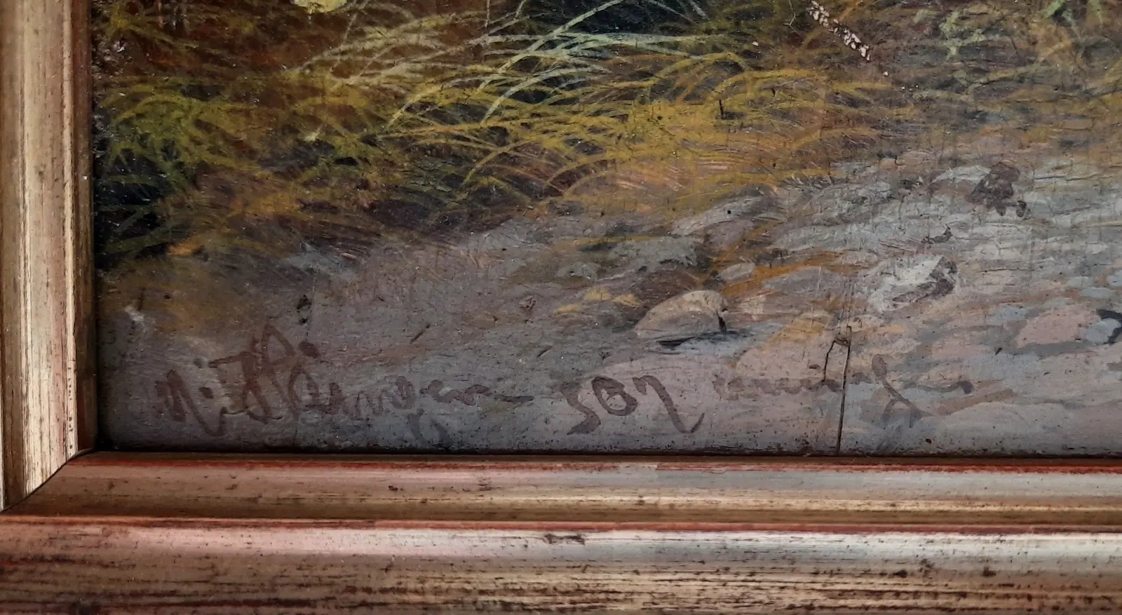 olej / sklejka; sygn. l.d. "M. Hanger '902'.....?"; wymiary: 20,5 cm x 40 cm, rama listwowa, stan zachowania: dobry, na ramie ślady po drewnojadach; Niemcy I poł. XX w.