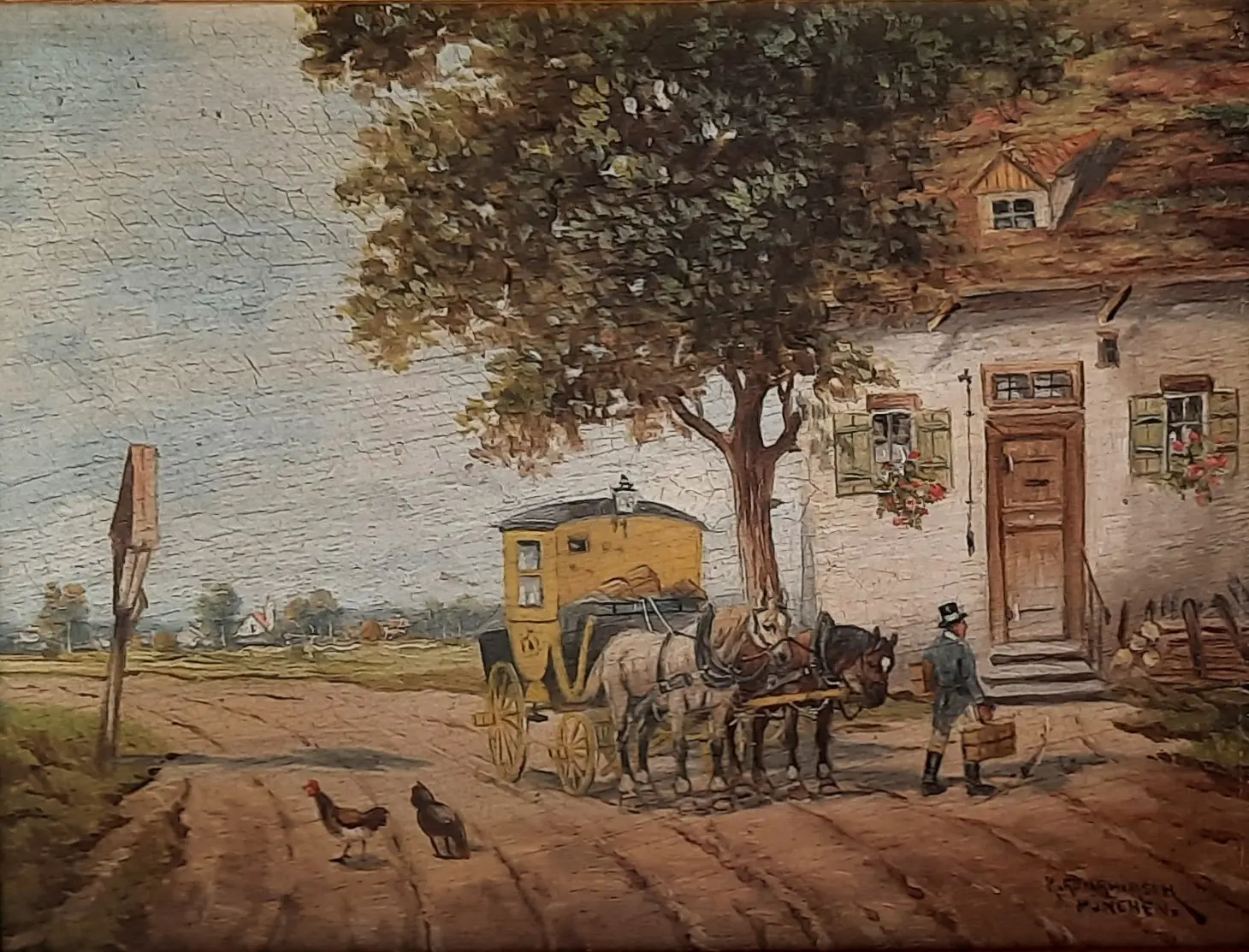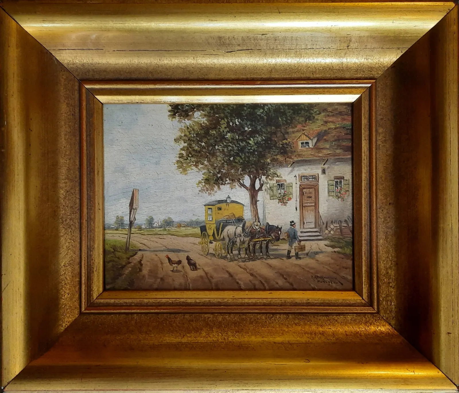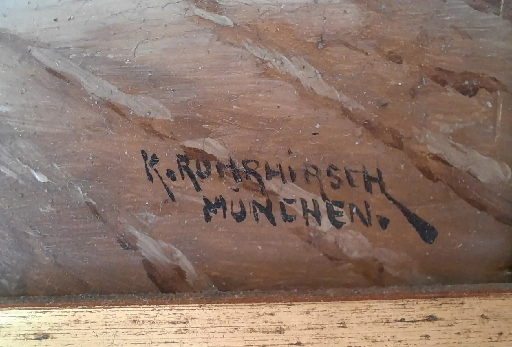 olej / sklejka; sygn. p.d "K. Rohrihrich Munchen"; wymiary: 13,3 x 18 cm.; rama drewniana złocona; stan zachowania: delikatne ubytki ramy; Niemcy I poł. XX w.