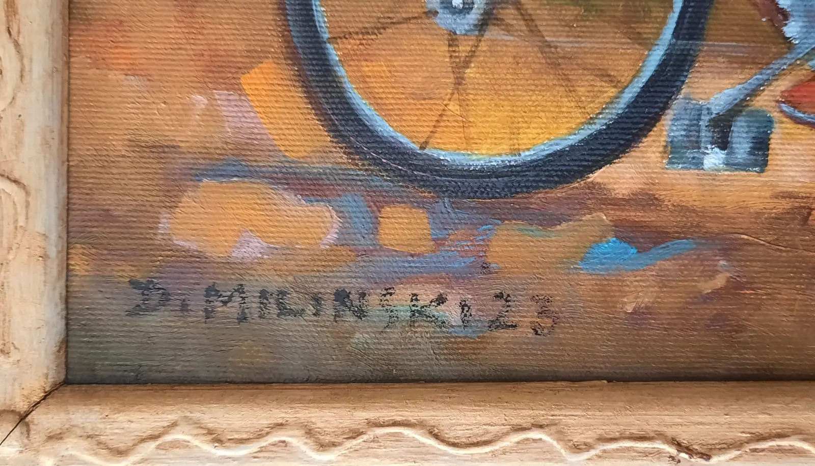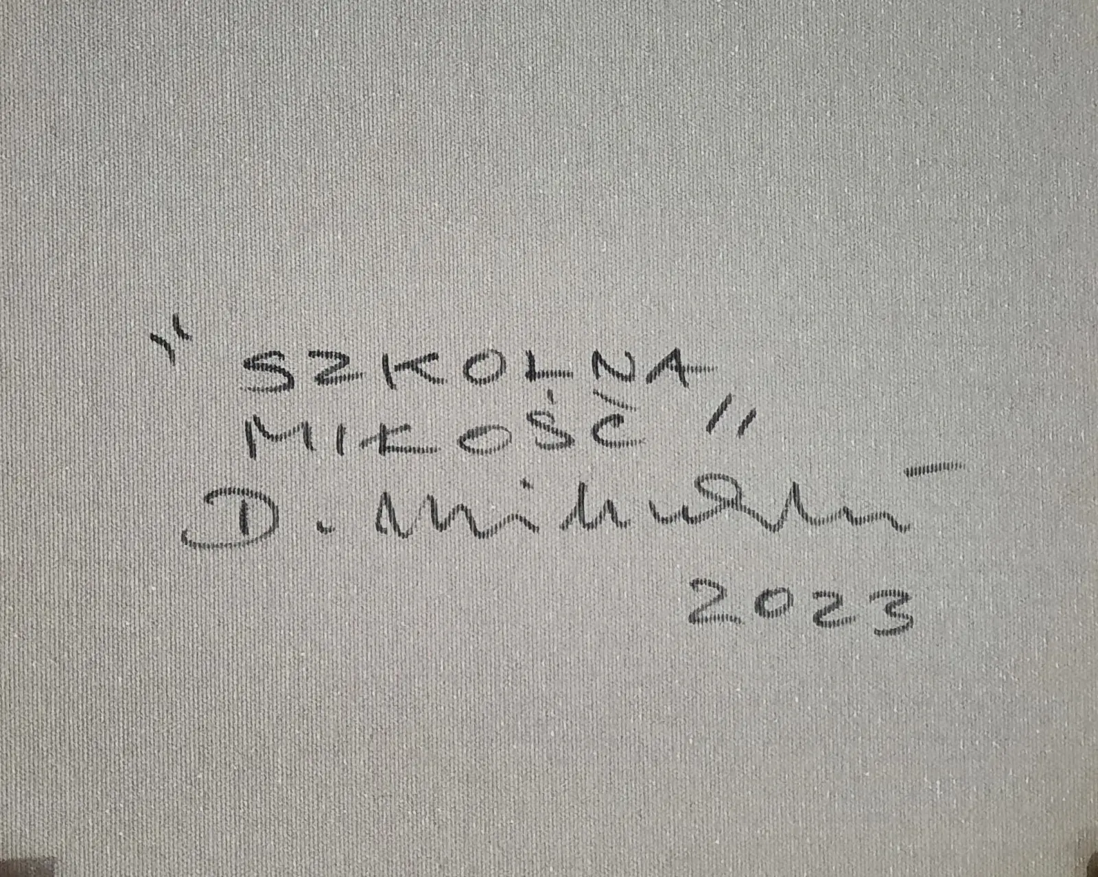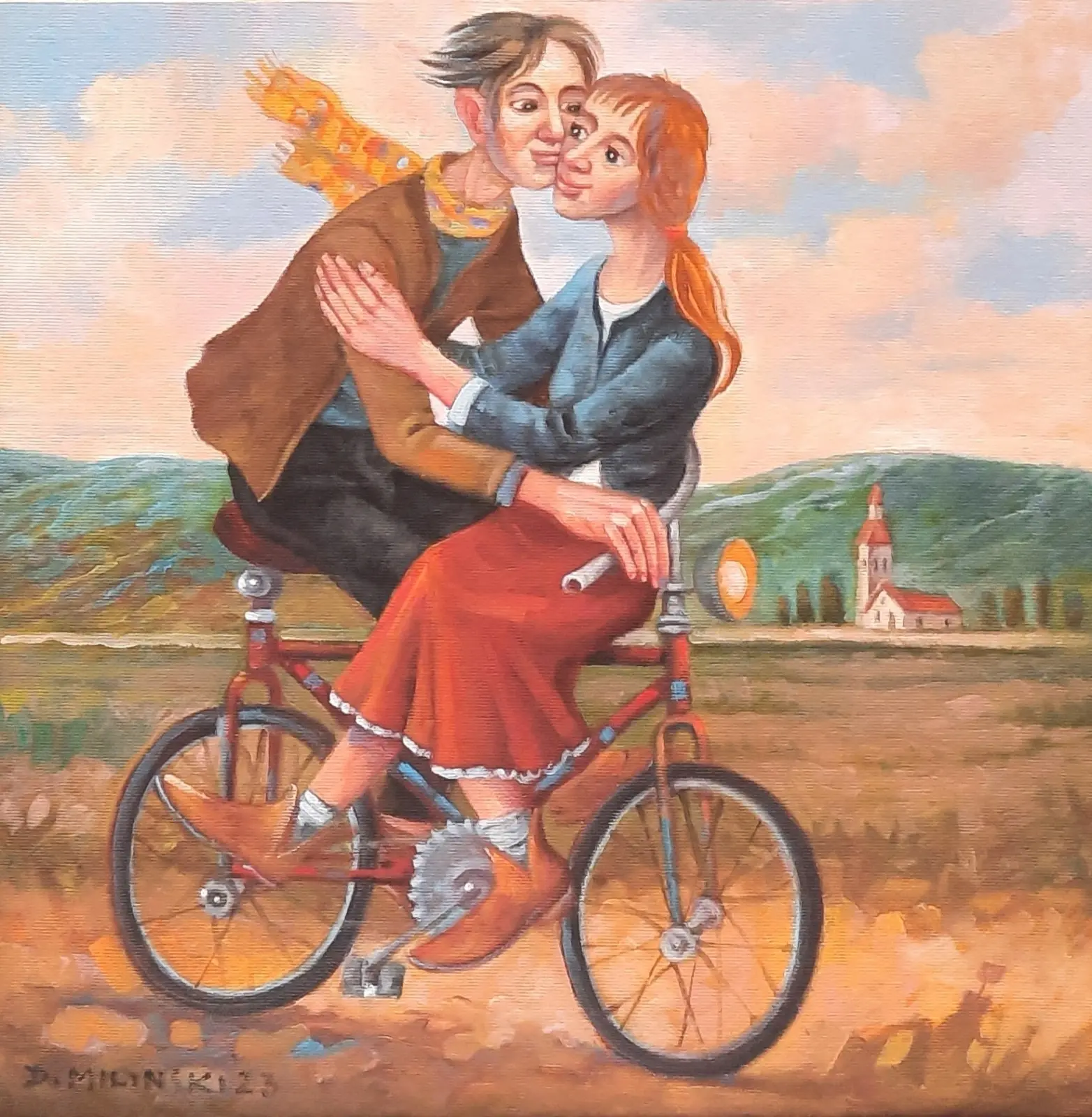 olej / płótno; sygn. l.d. "D. Miliński 23"; wymiary: 40 x 40 cm; opisany autorsko na odwrociu: '"Szkolna miłość", D. Miliński 2023'; oprawa autorska, drewniana, malowana, złocona.
