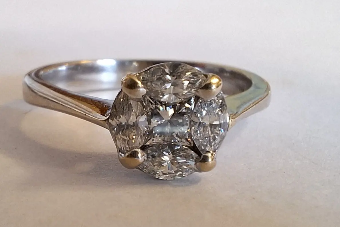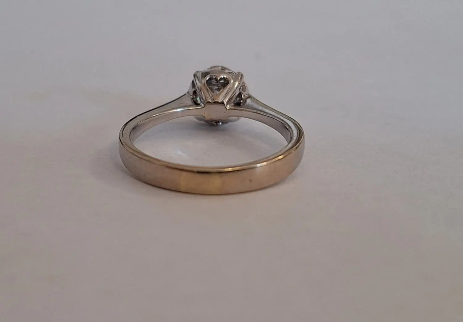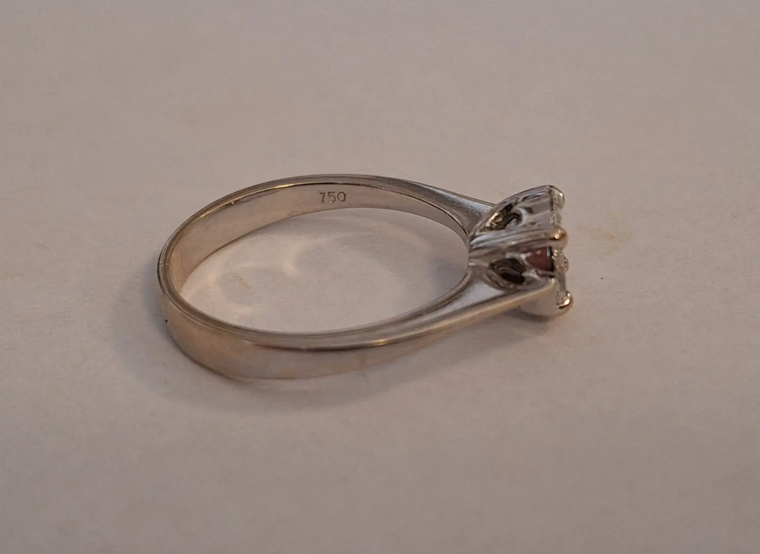 Białe złoto pr. 0,750 , 1 diament o szlifie brylantowym i masie około 0,22 ct. , barwie F , czystości VS2 oraz 4 diamenty o szlifie brylantowym , masie około 0,50 ct. , barwie F-H i czystości SI1-I1.Waga 3,81 g