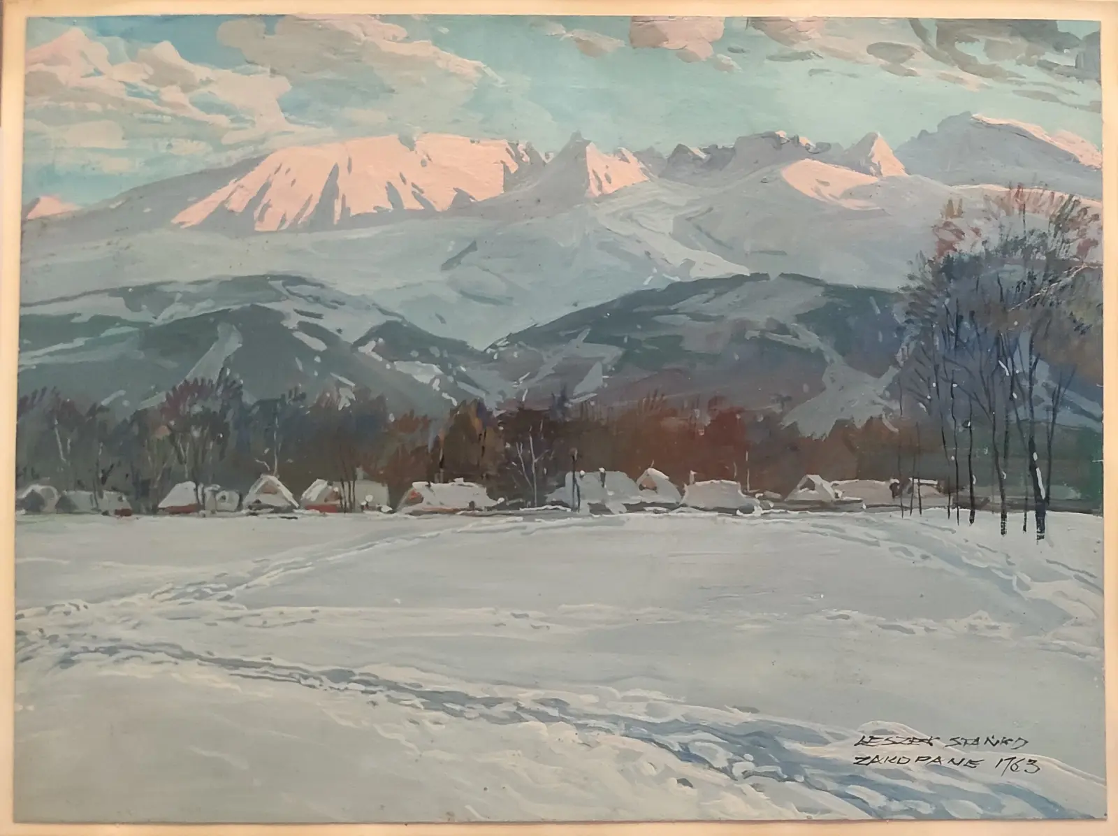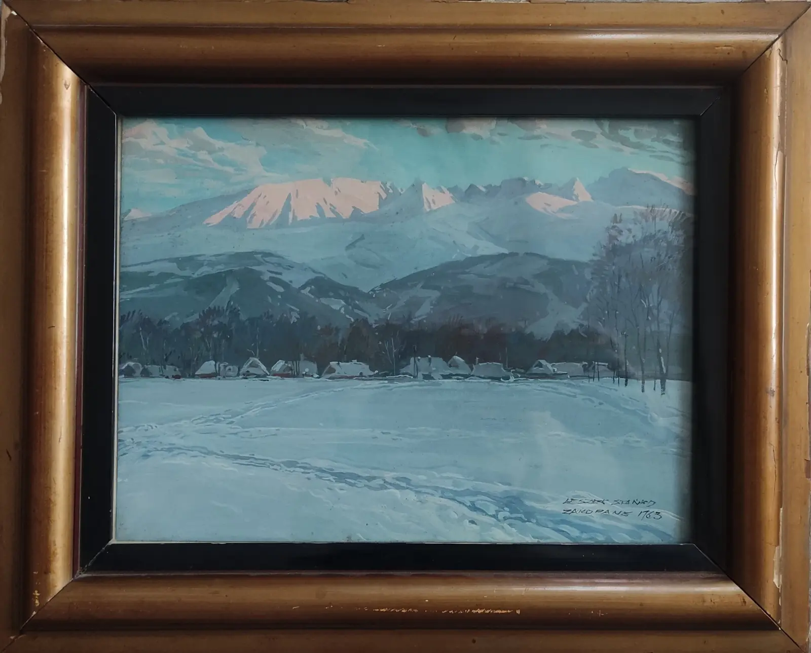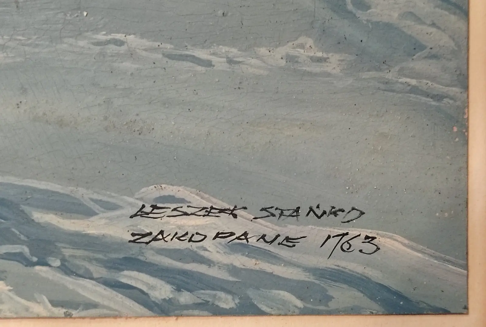 olej/karton naklejony na tekturę, wym. 21 cm x 28,5 cm, sygn. p.d. Leszek Stańko Zakopane '1963 r.; oprawa drewniana, szklenie