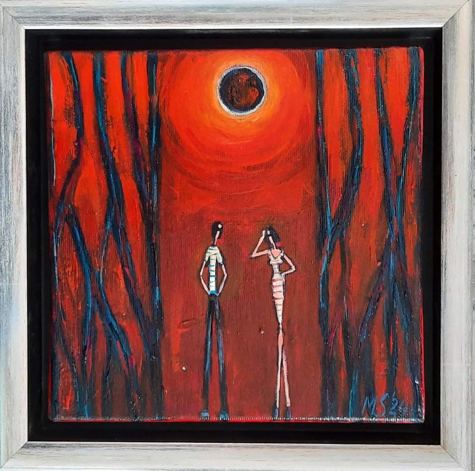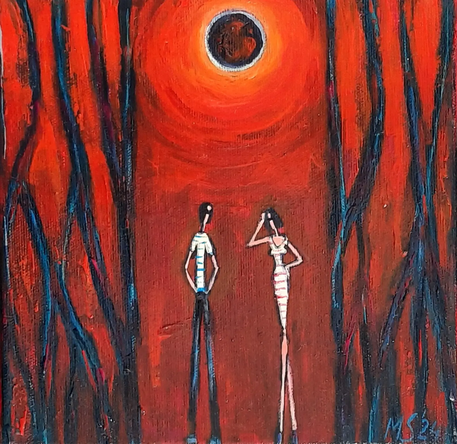 akryl / płótno; sygn. p.d: 'MS24', wymiary: 20 x 20 cm; obraz opisany autorsko na odwrocie: ' Małgorzata Stępniak "Zaćmienie" 20 x 20 2024', oprawa listwowa
