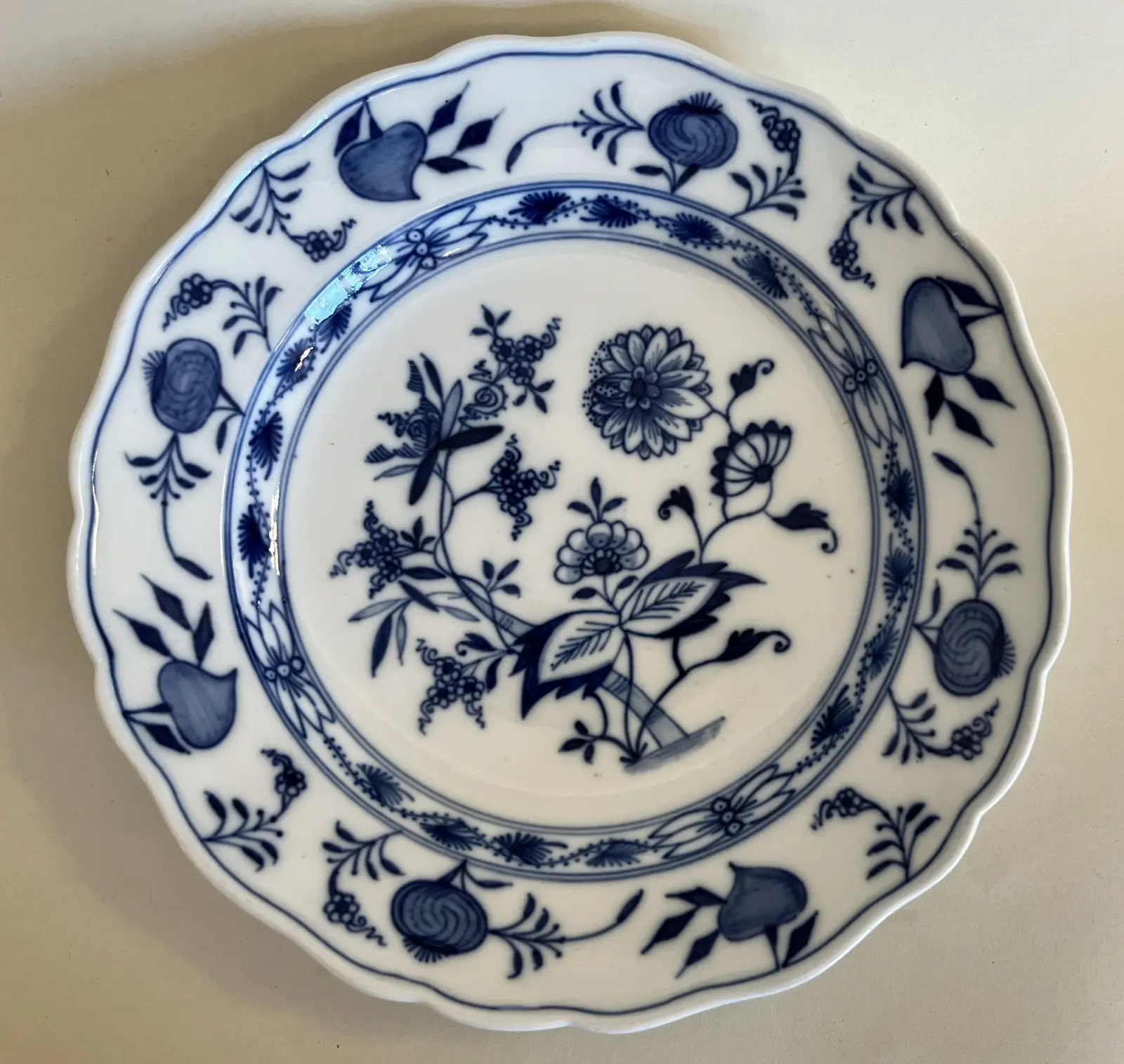 Porcelanowe talerze obiadowe produkcji miśnieńskiej, malowane kobaltem podszkliwnie, zdobione wzorem cebulowym, śr. 25 cm, sygnatura z przełomu XIX/XX wieku.
