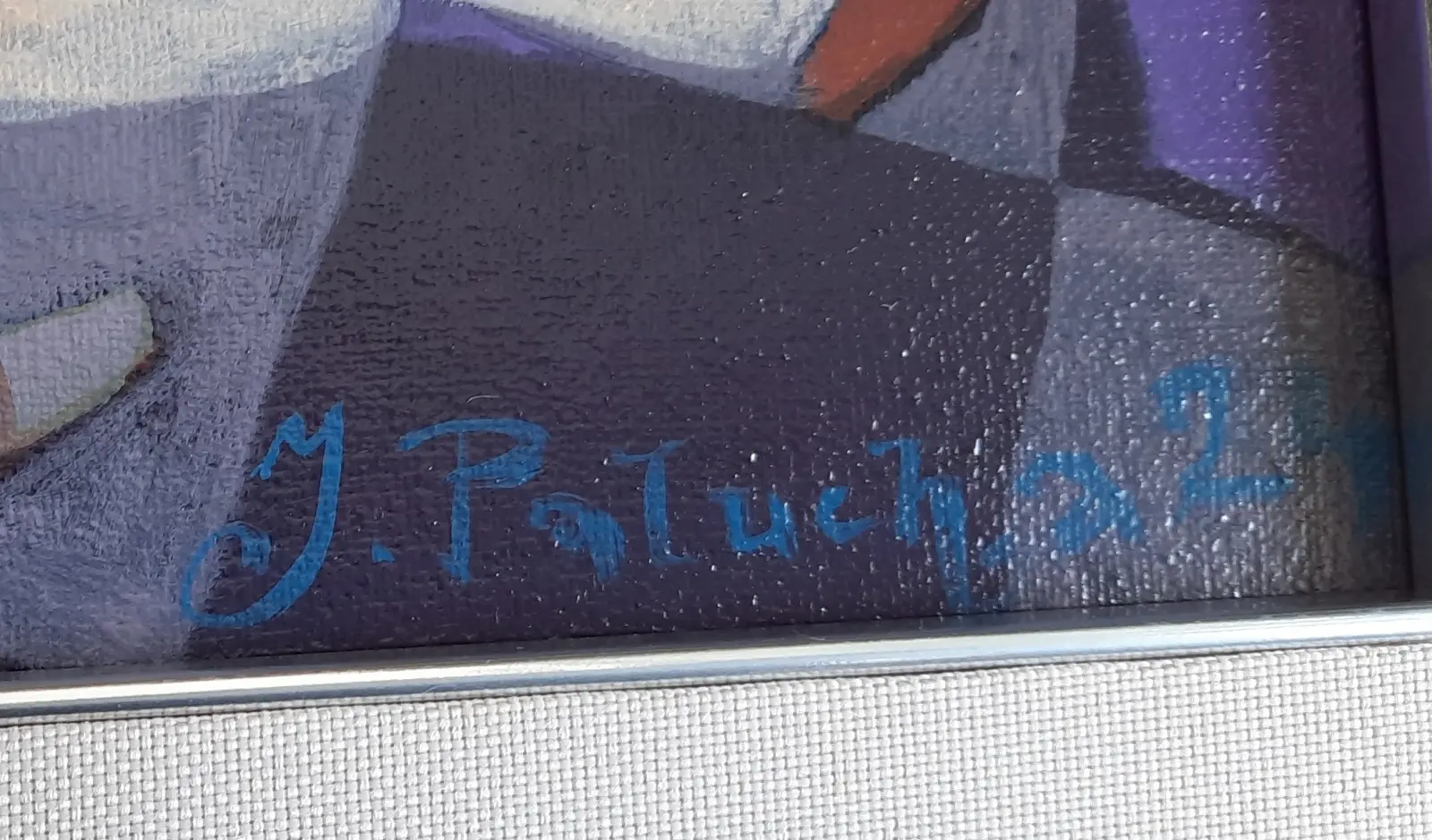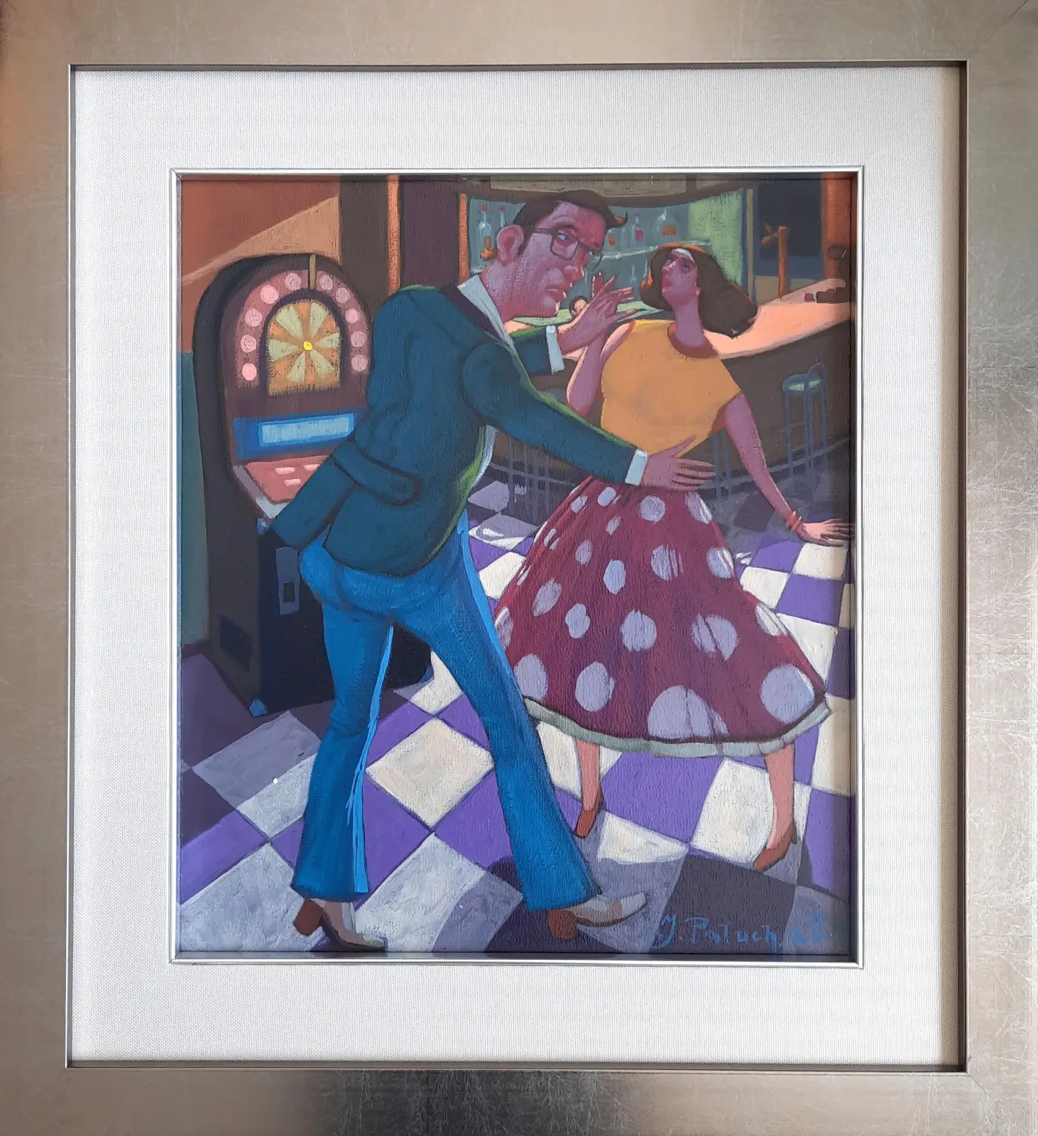 akryl / płótno; sygn. p.d: 'J. Pałucha 24'; wymiary: 38 x 33 cm; obraz opisany autorsko na odwrocie: '"Do grającej szafy grosik wrzuć...", J. Pałucha 2024'; oprawa listwowa, materiałowe passe-partout, 2024 r.