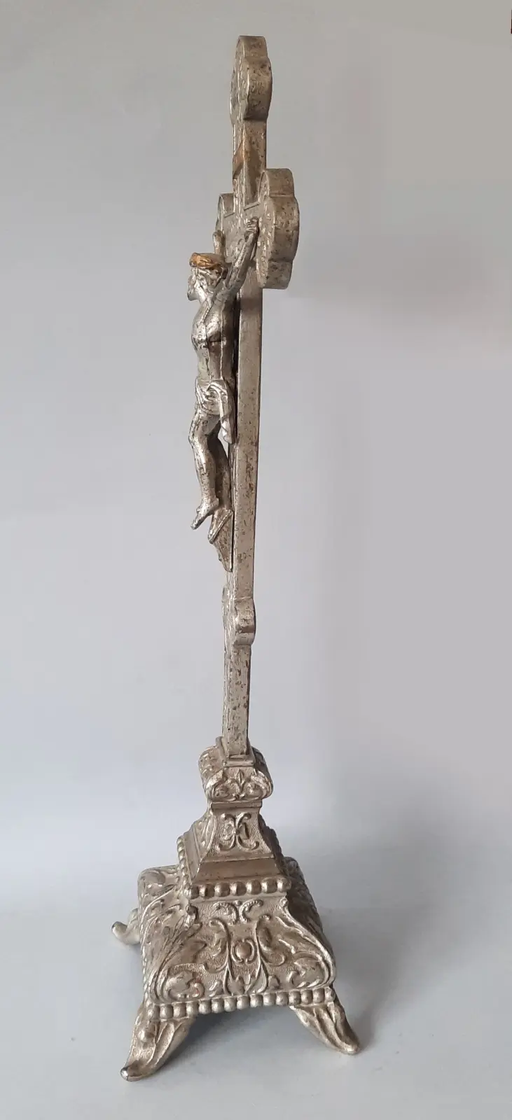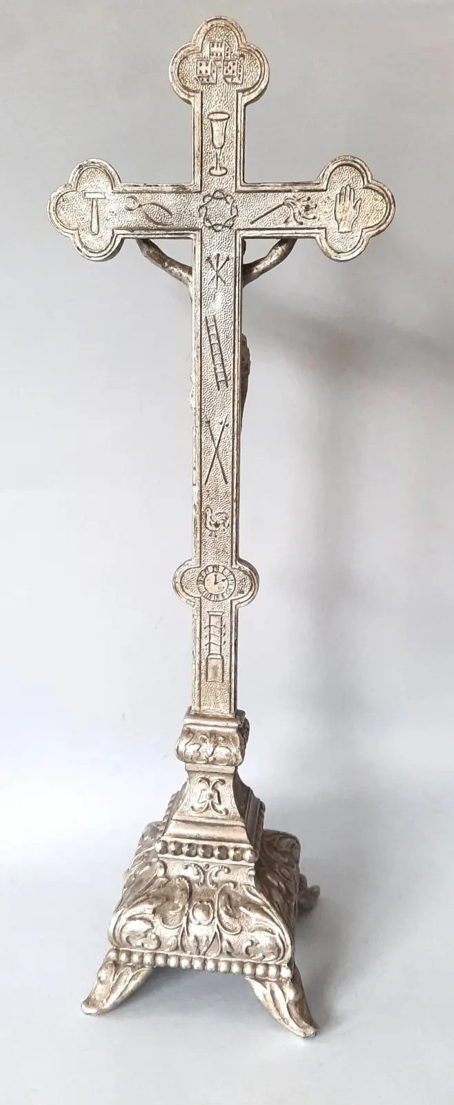 stop metali / odlew; krucyfiks zdobiony od tyłu symbolami Męki Pańskiej; wys. 51 cm; stan zachowania: ślady użytkowania; I poł. XX w.