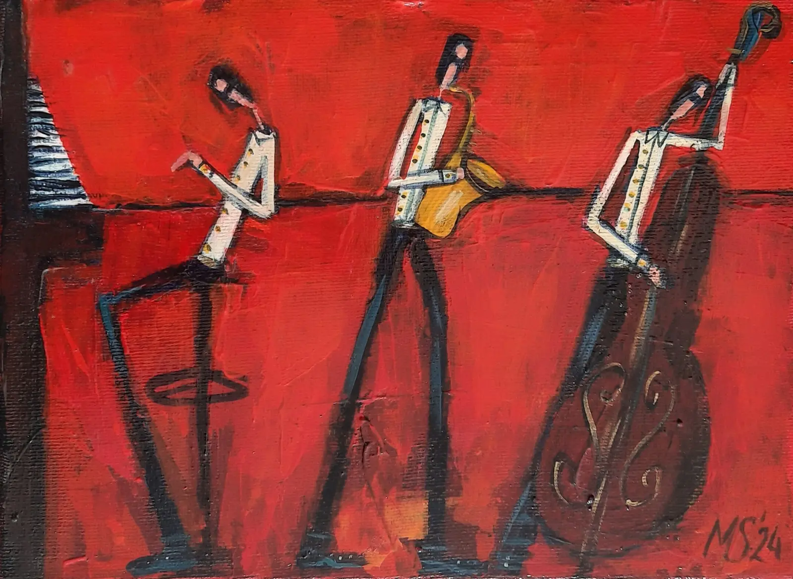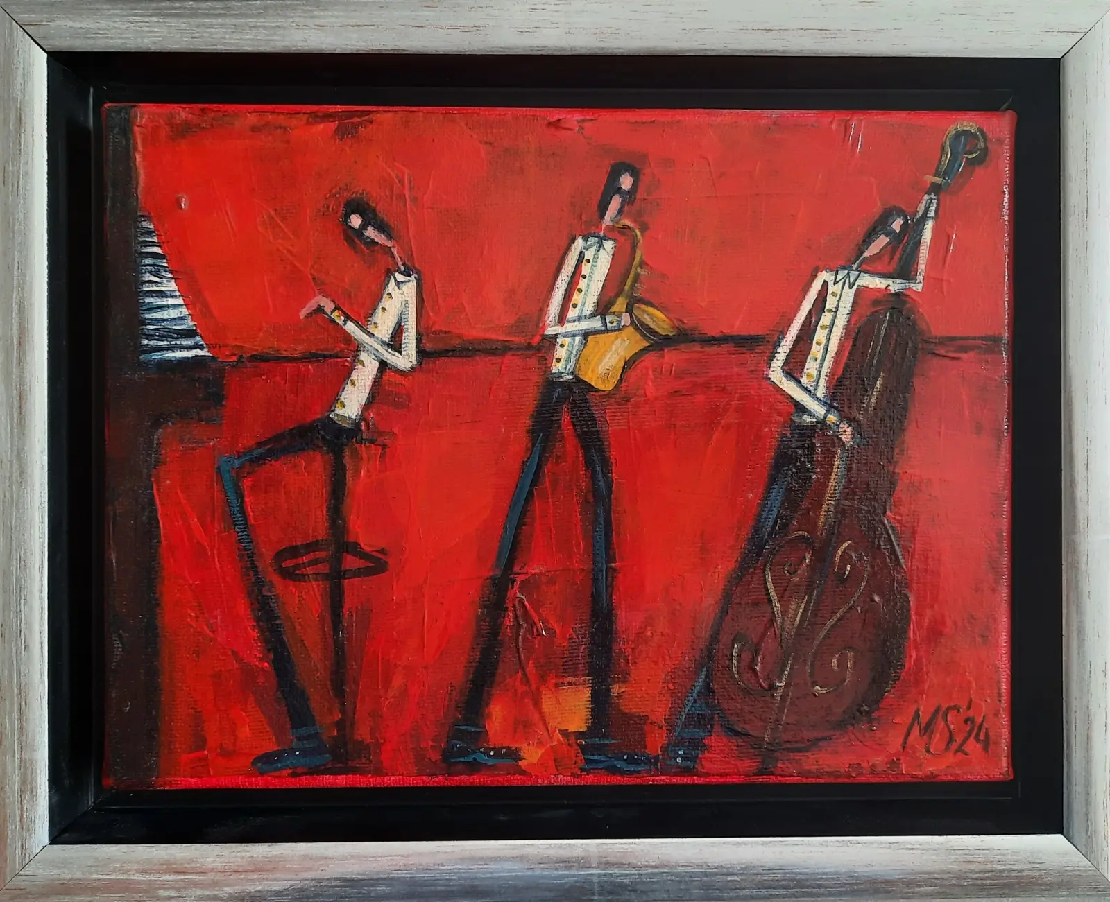 akryl / płótno; sygn. p.d: "MS'24", wymiary: 24 x 18 cm; obraz opisany autorsko na odwrocie: 'Małgorzata Stępniak "Trio" 24 x 18, 2024', oprawa listwowa; 2024 r.