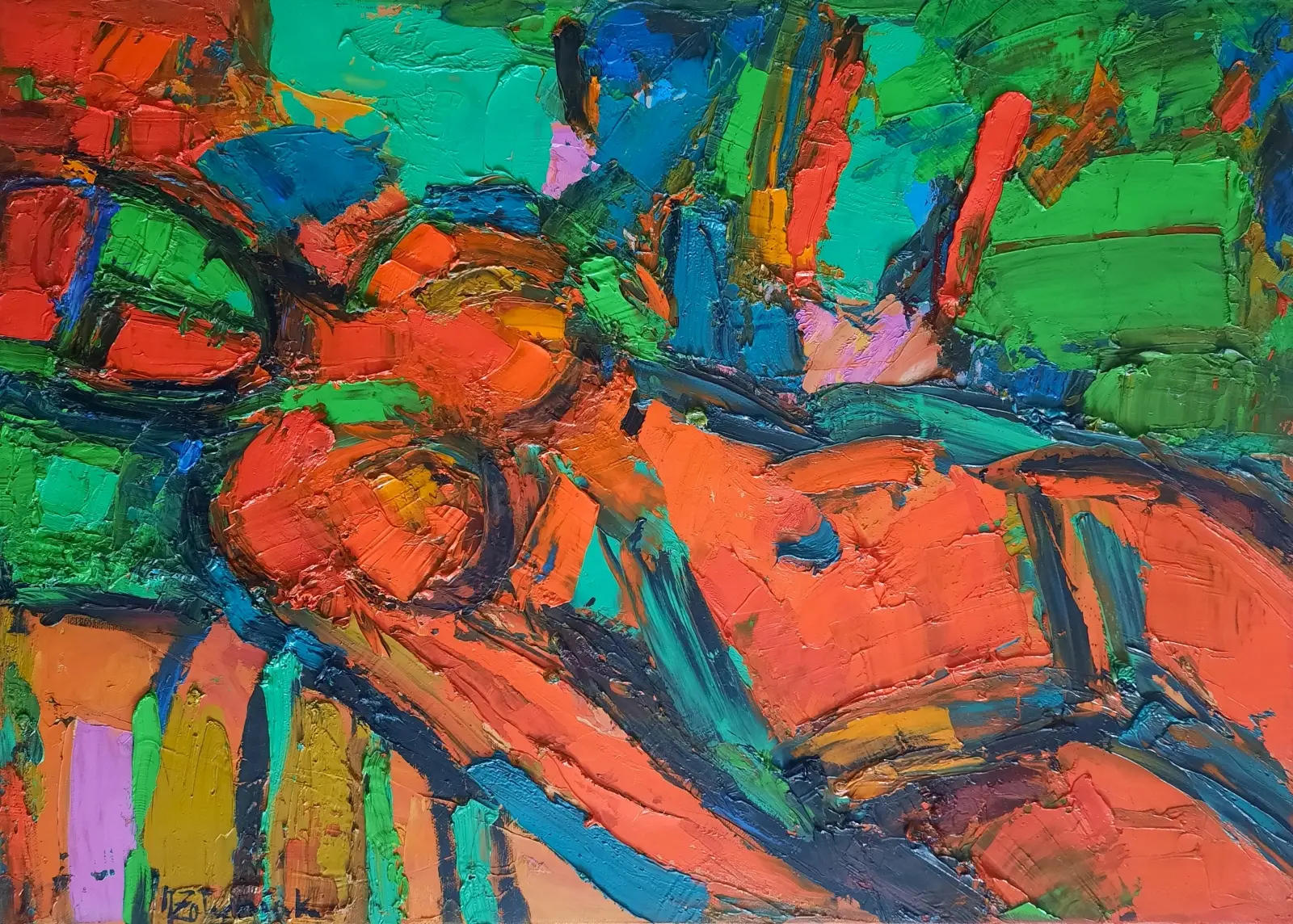 olej / płótno; sygn. l.d. 'J. Żołyniak'; wymiary: 50 x 70 cm; obraz opisany autorsko na odwrociu: 'Jadwiga Żołyniak / "Akt w czerwieni" / olej na płótnie / 50 x 70 / 2022'; brak oprawy; 2022 r.