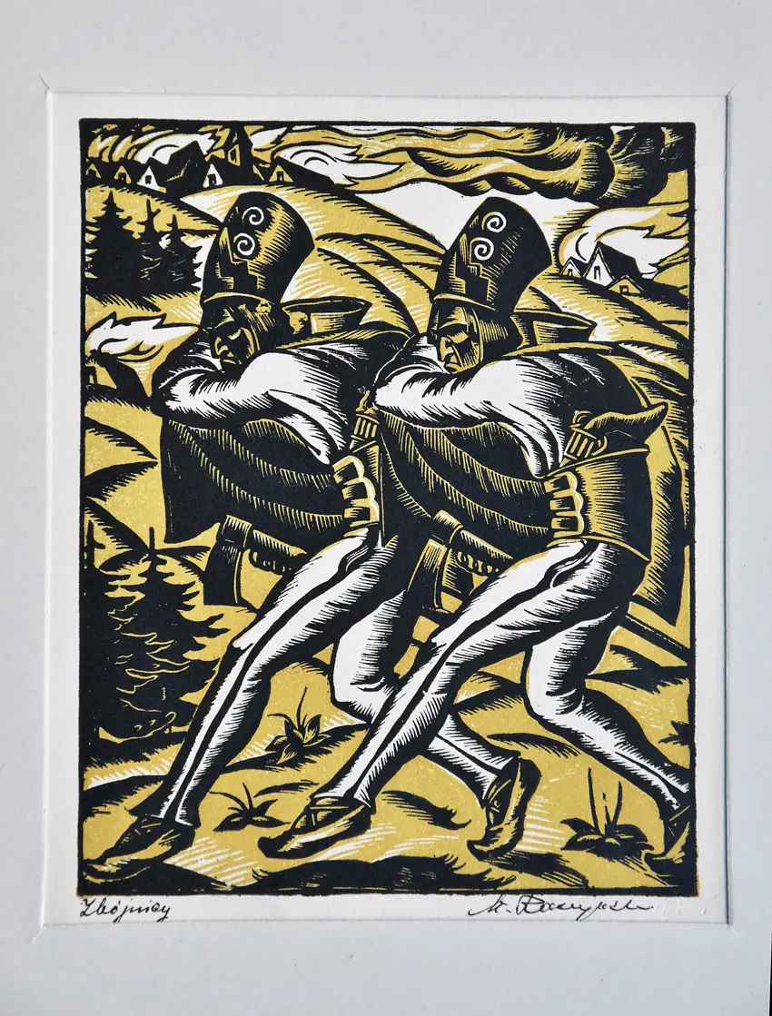 sygn. na klocku p.d.: St. Raczyński; na klocku l.d. tytuły: Andrzejki, Z kolędą, Wielkanoc, Śmigus, Lajkonik, Zbójnicy; oprawa tekturowa, w formie teki, zielona, z tłoczonymi złoconymi napisami: Polskie Tematy Ludowe / 6 drzeworytów / St. Raczyński.