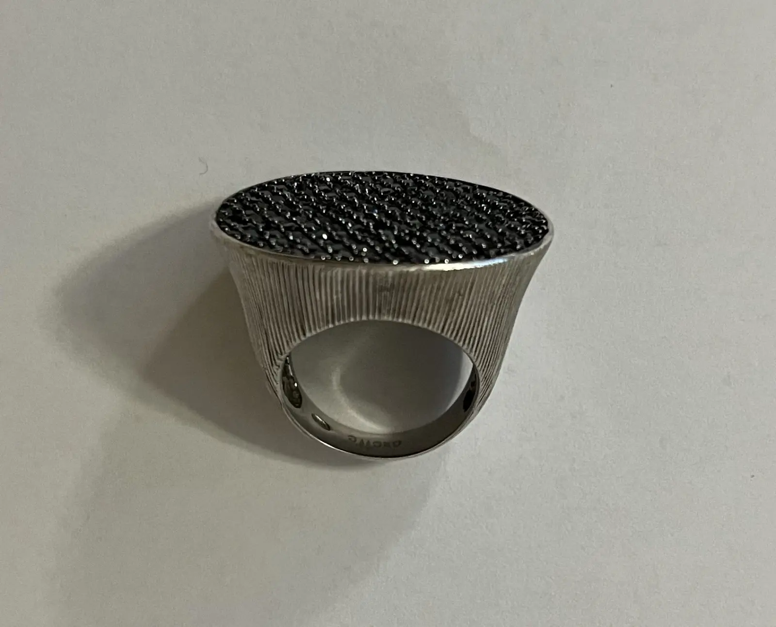 Pierścionek srebro pr. 925,  czarne cyrkonie, waga 14 g. Rozmiar 12.  Pierścionek wyprodukowany przez grecką firme Oxette (siedziba w Salonikach)