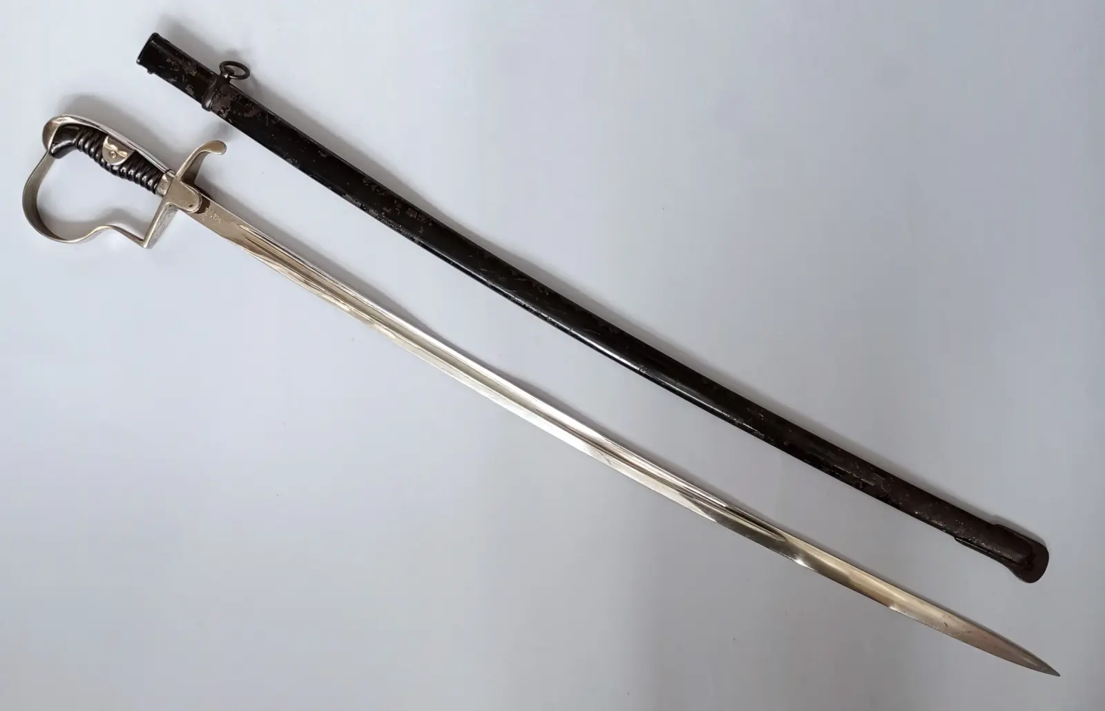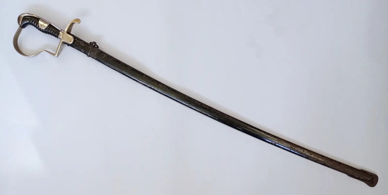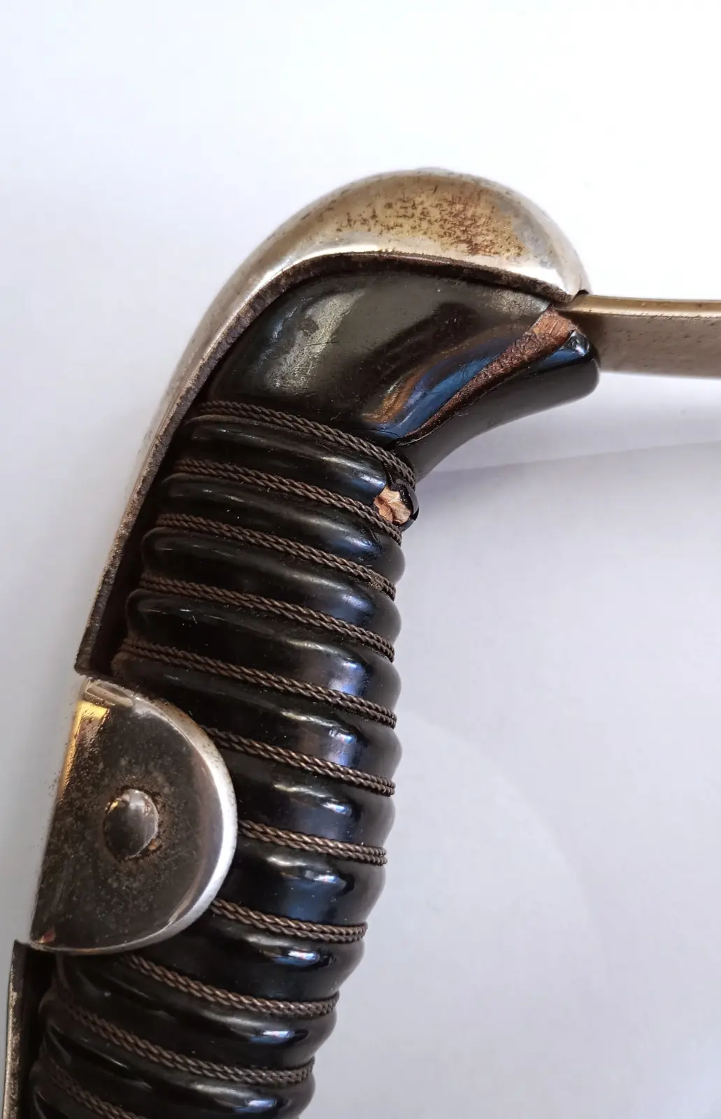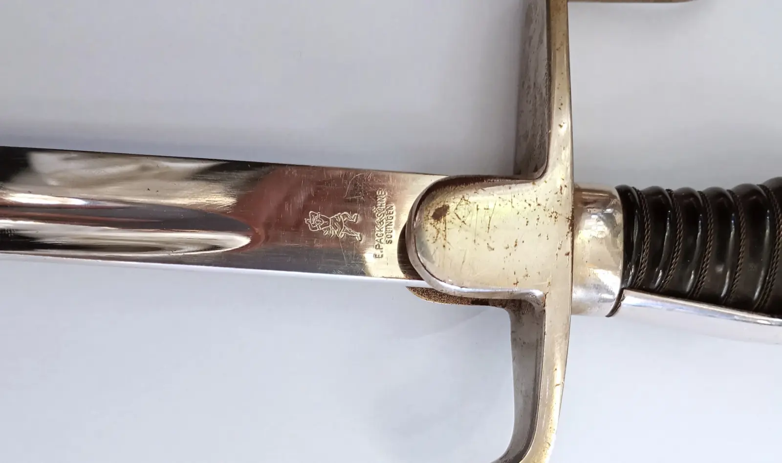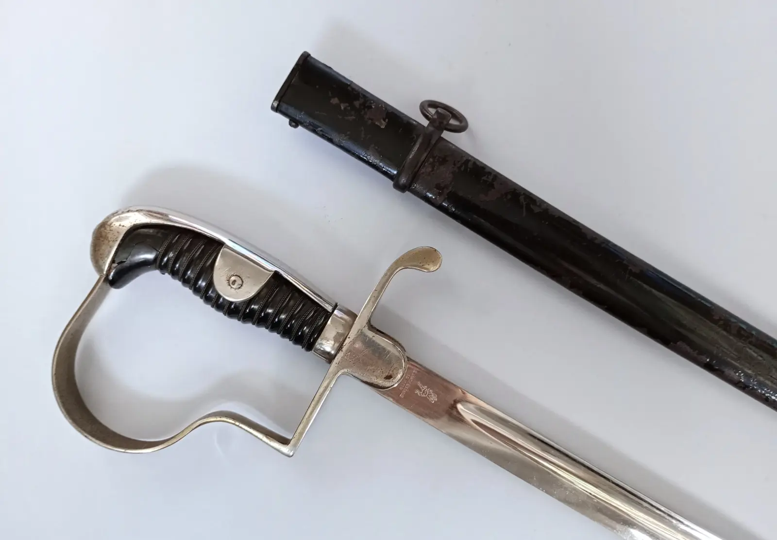 szabla oficera Wermachtu; sygn. u nasady głowni 'E. PACK&SOHNE SOLINGEN', dodatkowo na jelcu wybite litery 'GR'; długość całkowita -  94,5 cm, długość głowni - 81,5 cm, długość całkowita z pochwą - 97 cm, masa całkowita - 589 g, masa całkowita z pochwą - 1045,5 g; stan zachowania: ubytki rękojeści, ślady korozji, ślady użytkowania; lata 30/40-te XX w.
