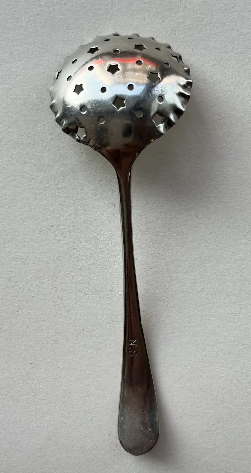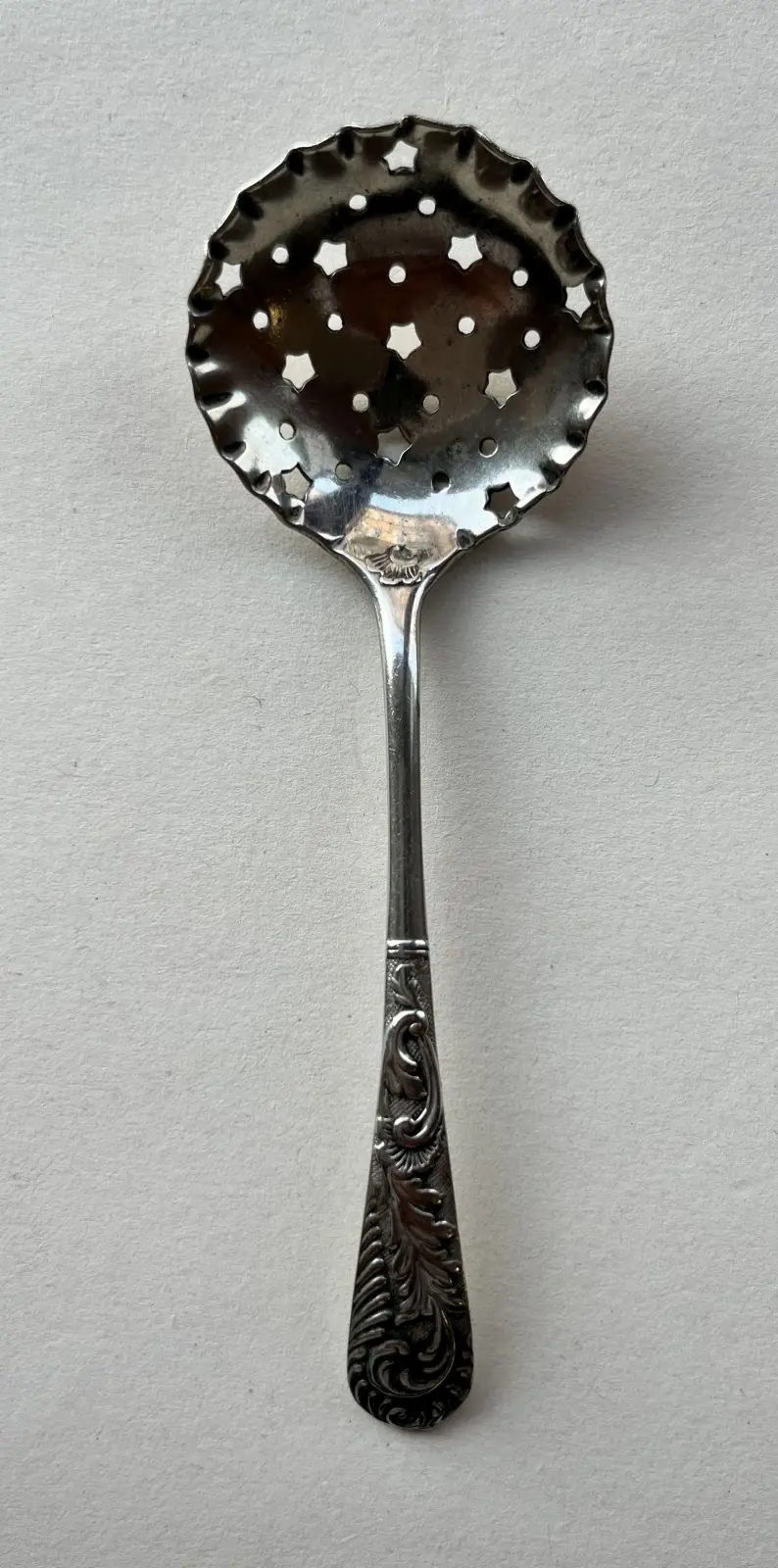Ażurowa łyżeczka do cukru pudru, metal srebrzony, dł. 11,5 cm.