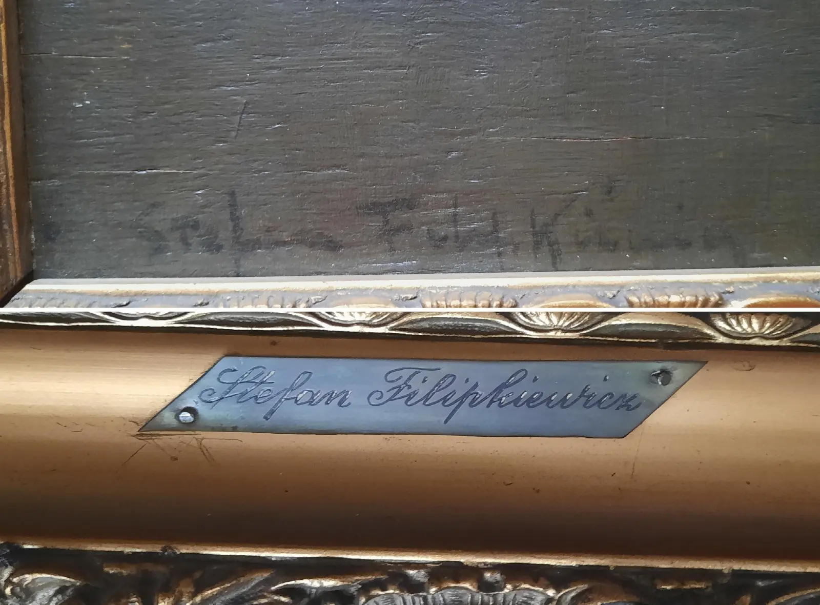 olej / sklejka; sygn. l.d: 'Stefan Filipkiewicz'; wymiary: 31,3 cm x 45,5 cm; oprawa drewniana złocona, aplikacje gipsowe; stan zachowania - spękania sklejki; na ramie umieszczona tabliczka z imieniem i nazwiskiem: "Stefan Filipkiewicz", na odwrocie pieczątka z opisem: 'Grupa Malarzy Polskich w Krakowie / nr 73 / autor Stefan Filipkiewicz / tytuł dzieła Róże salonowe / technika olej zagraniczny / cena 180; I poł. XX w.