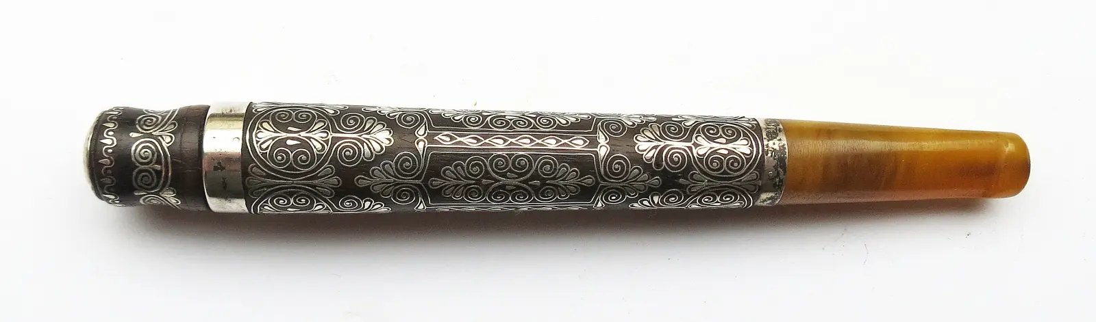 drewno inkrustowane srebrem (brak oznaczeń srebra), ustnik bakelit, dł. 13 cm; oryginalne tekturowe etui. Stan zachownia dobry.