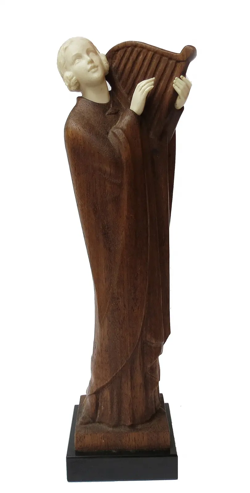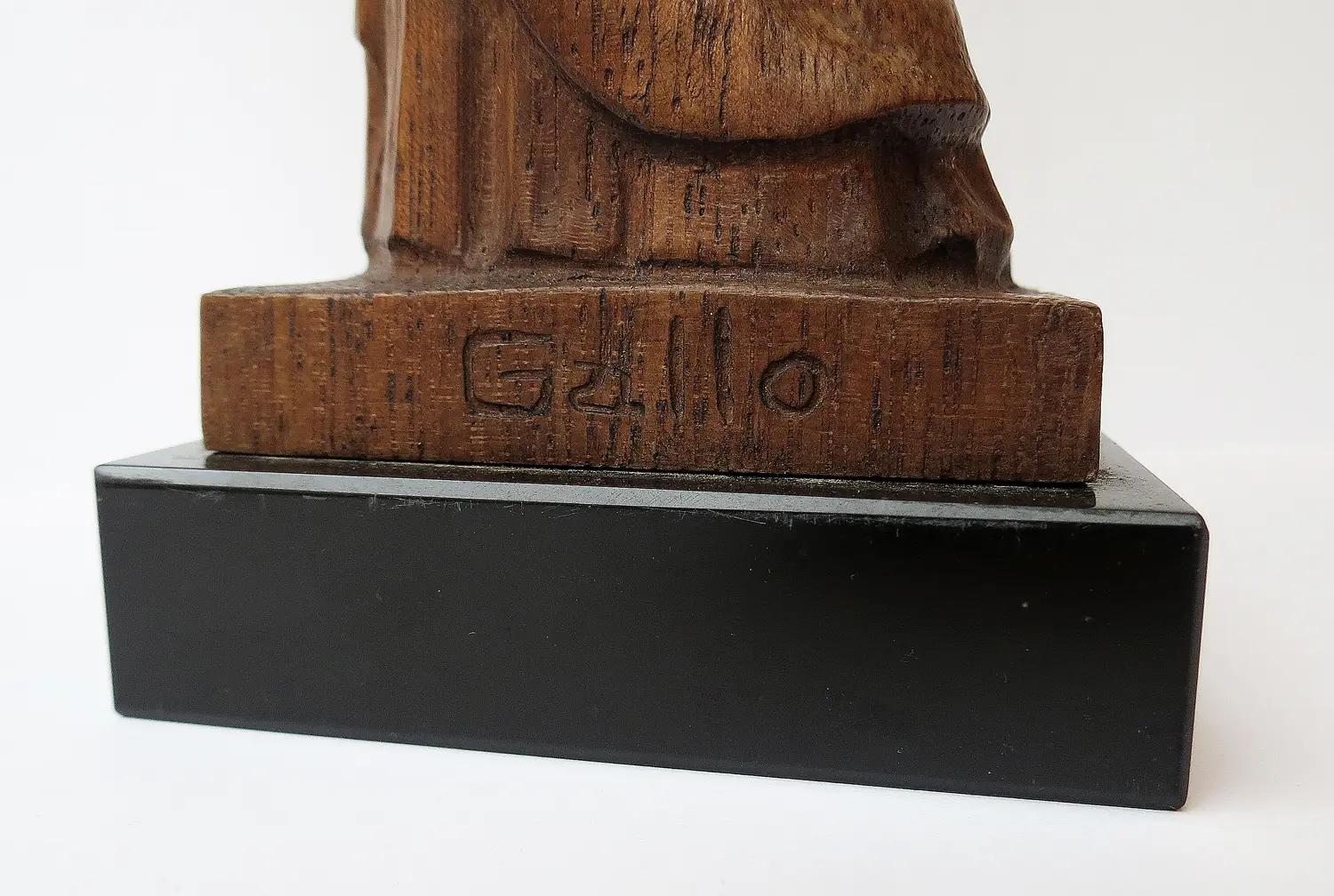 rzeźba pełna w drewnie, głowa i dłonie  kość słoniowa, wym.: 33 x 9 x 7,5 cm, podstawa czarny kamień, u dołu sygnatura: Gallo (Ignacio Gallo ? 1887-1956).
