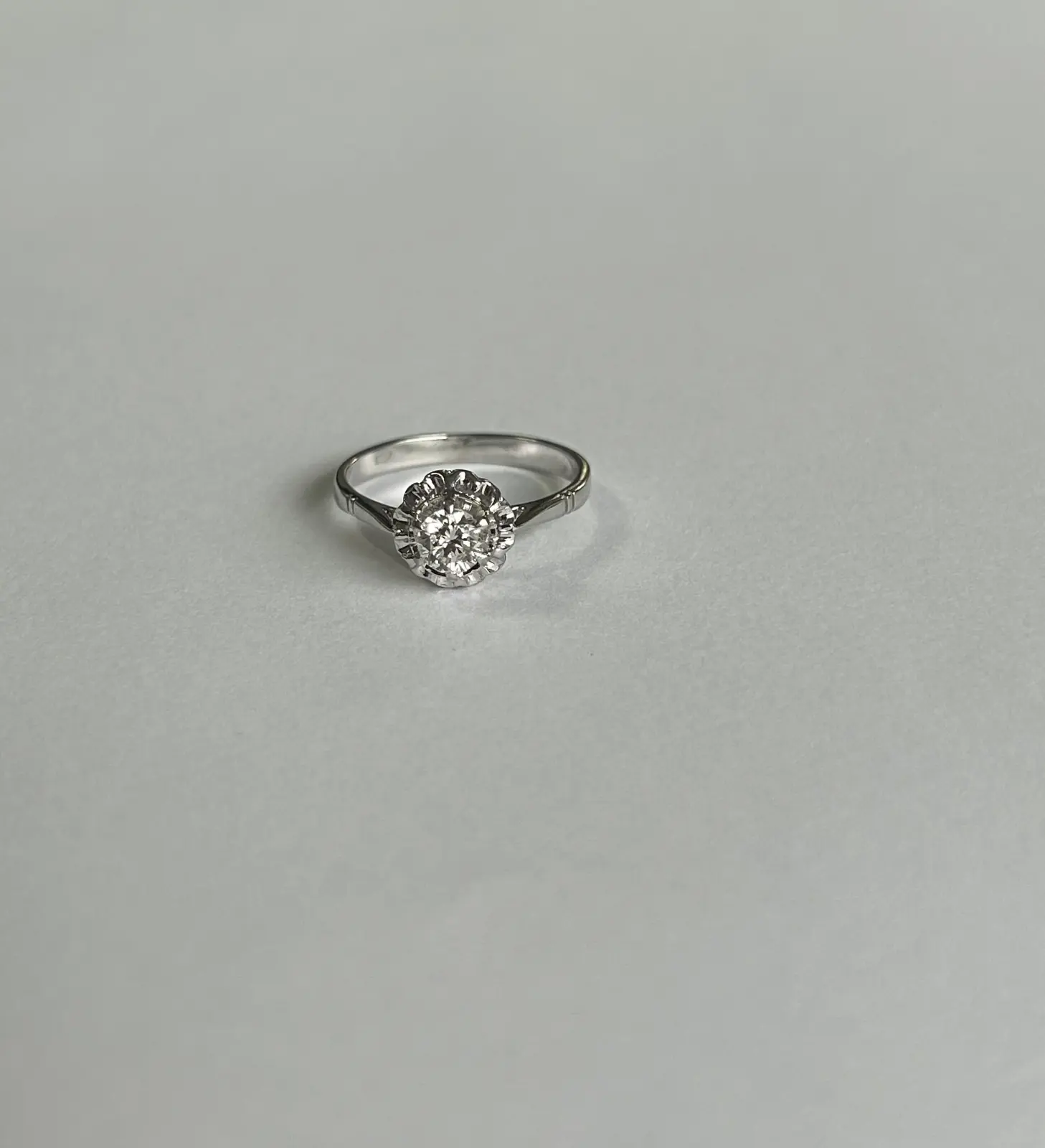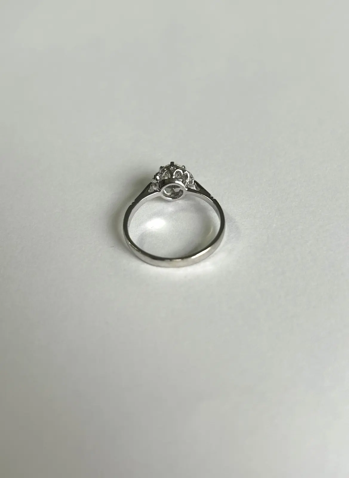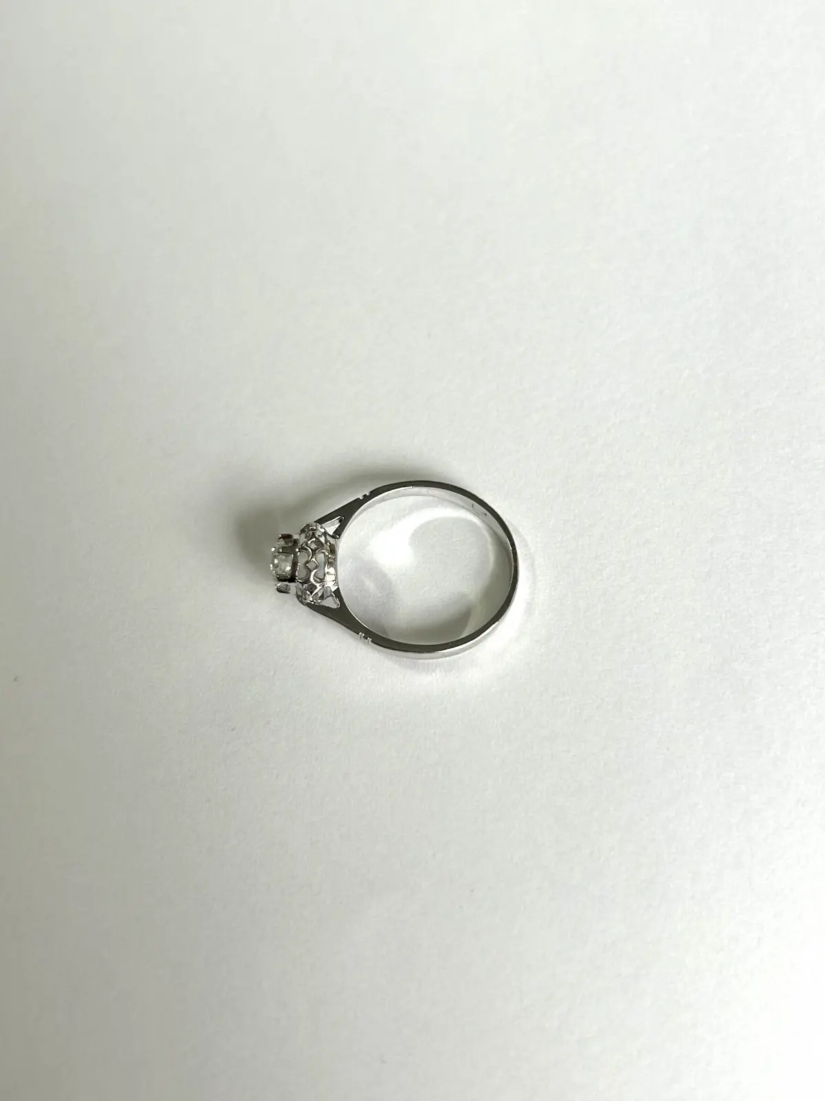 Pierścionek z białego złota próby 750 z diamentem. Oprawa diamentu centralna 6 łapek oraz oprawa chaton. Sygnatura zatarta.