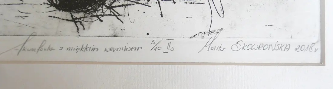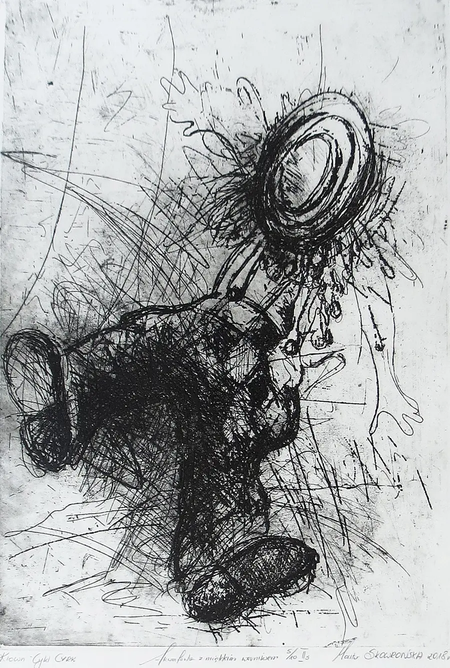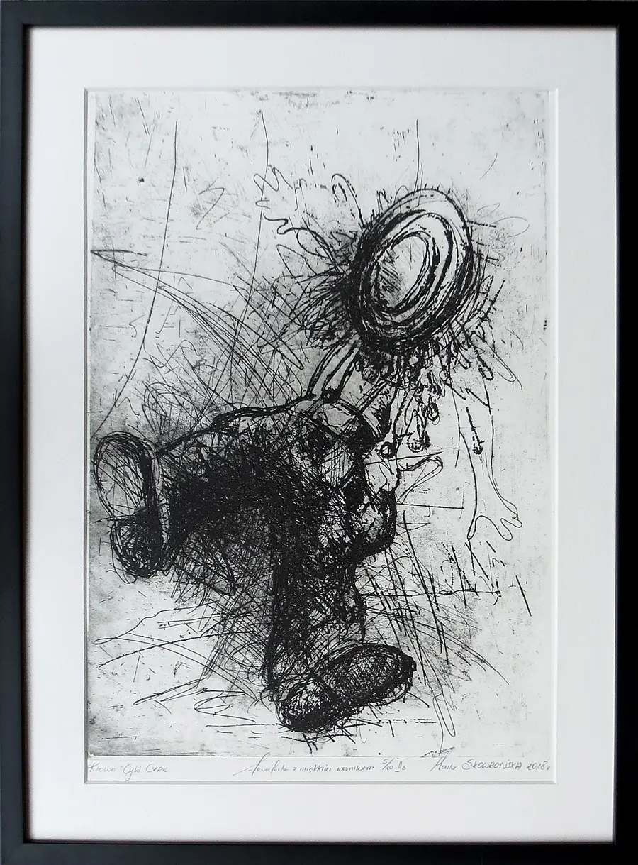 akwaforta, miekki werniks, 38,6 x 27,3 cm, sygn. p.d.: Marta Skowrońska 2018; oł. l.d.: Klown Cykl Cyrk, Akwaforta z miękkim werniksem 5/10 IIs