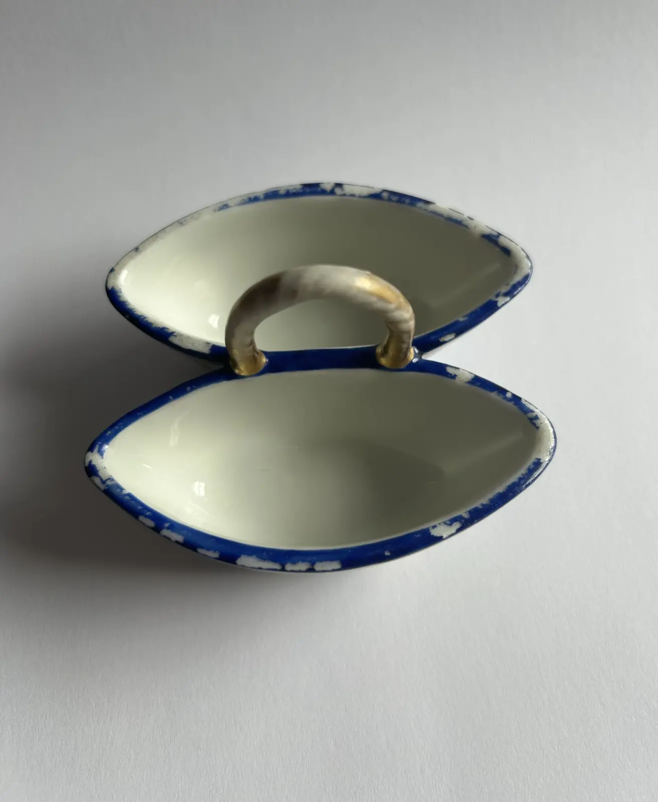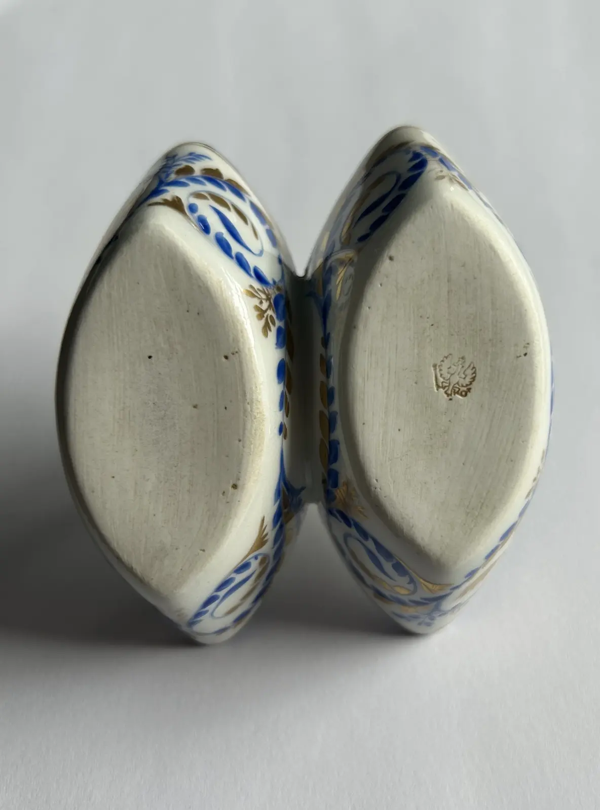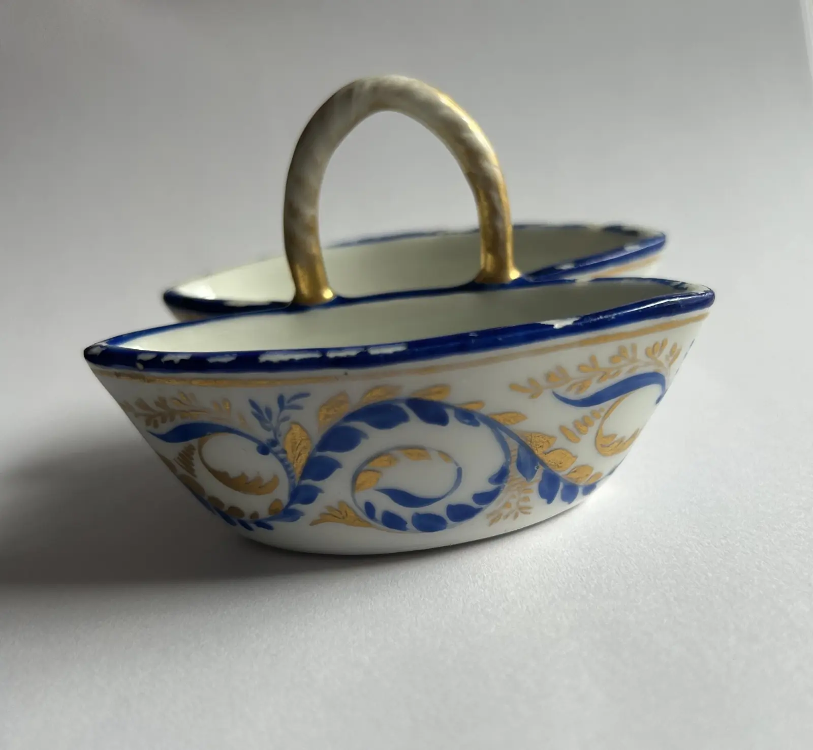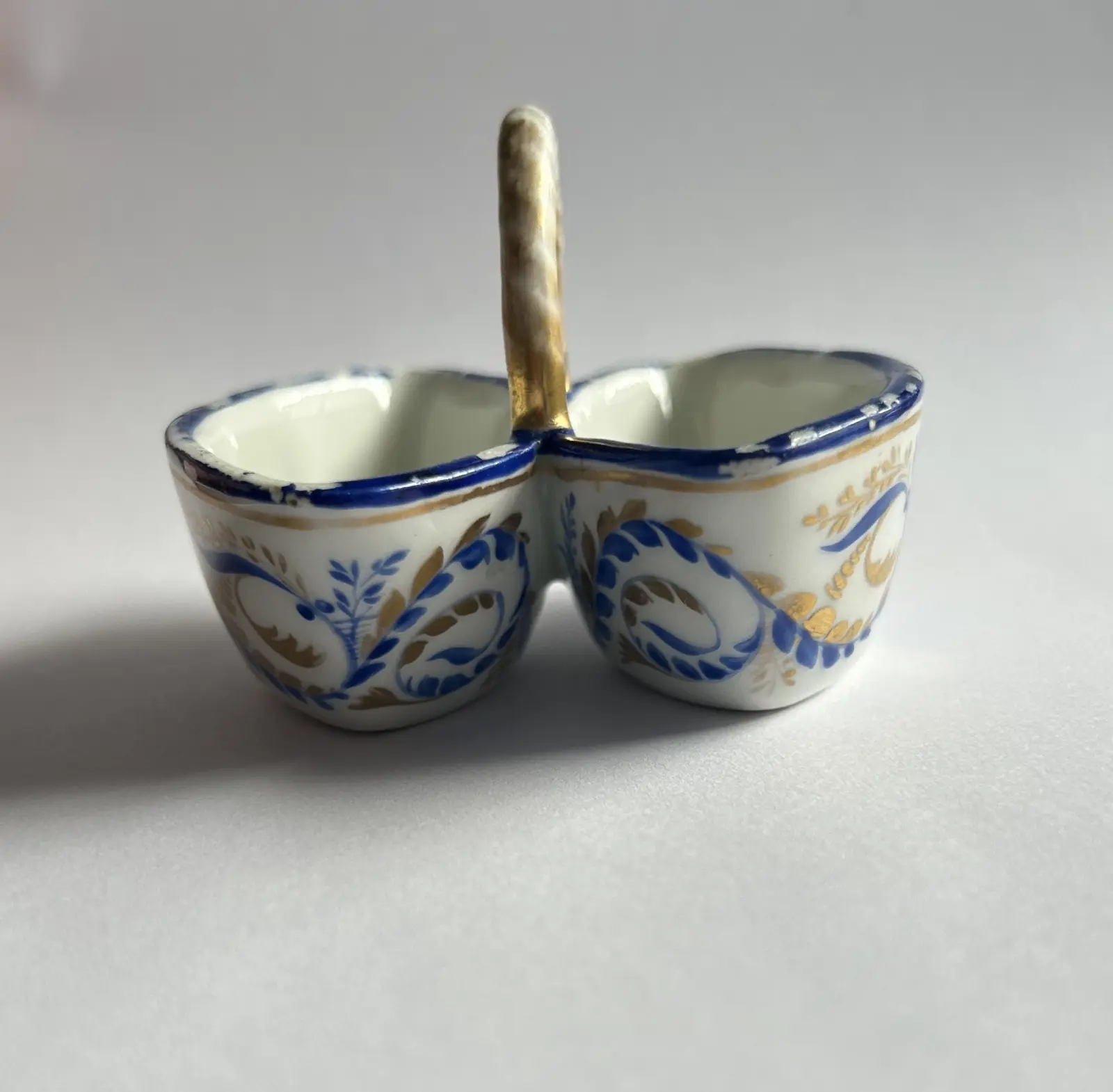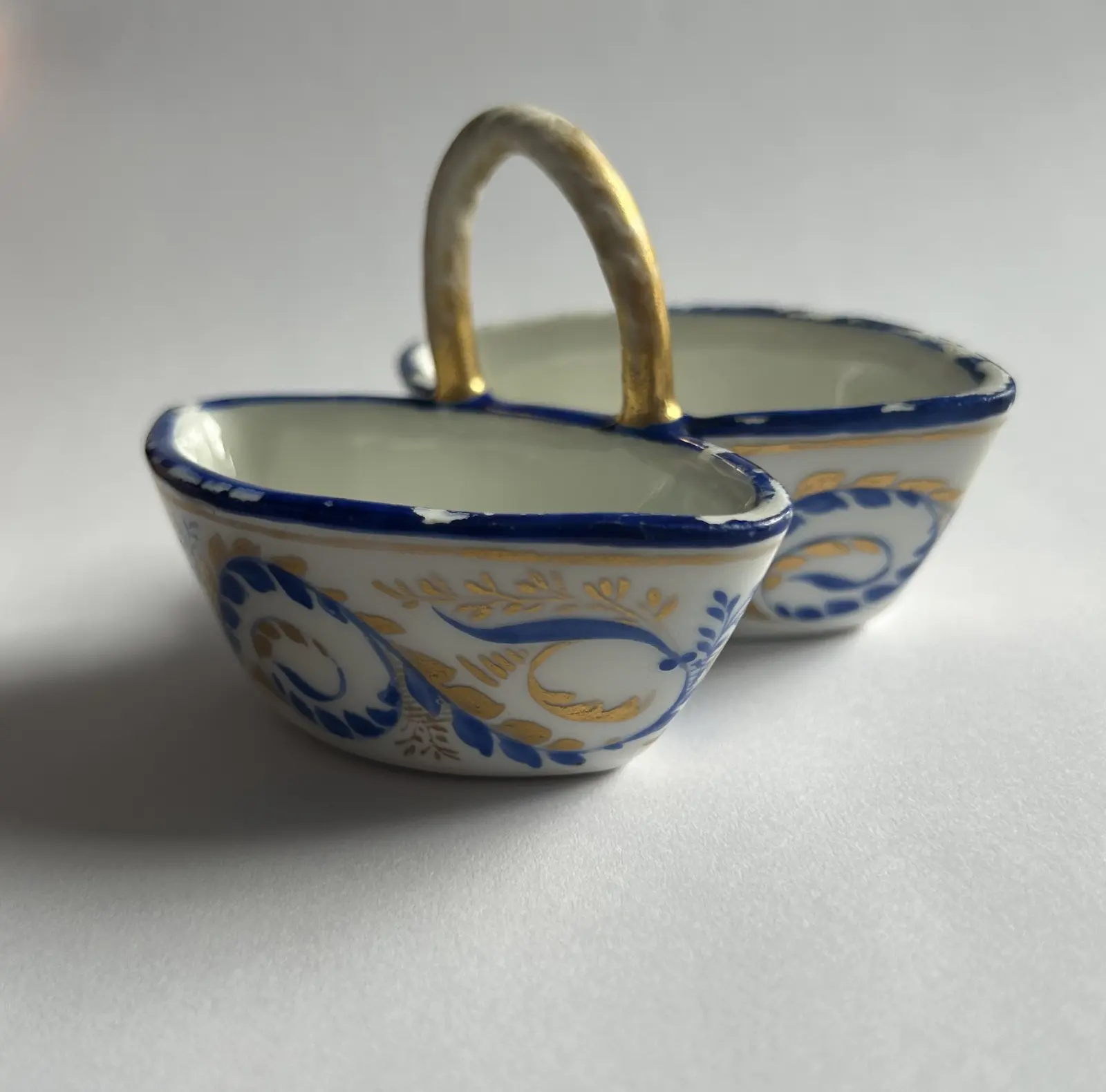 Podwójna porcelanowa solniczka, ręcznie malowana, złocona, z wytwórni Zofiówka, Śląsk. Przetarta, mikrouszkodzenia przy wlewie, 4 ćwierć XIX w.