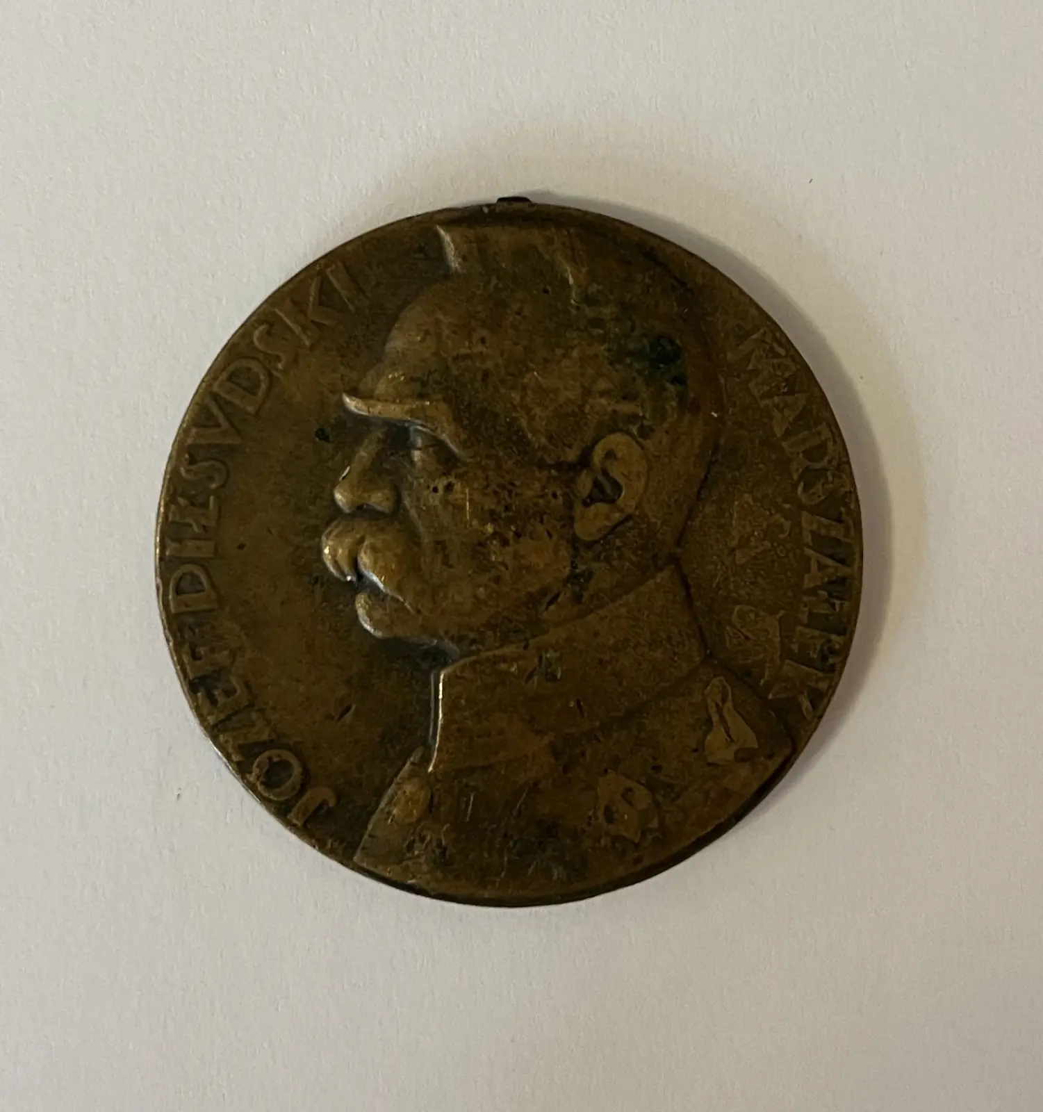 Medalion -plakieta z wizerunkiem Józefa Piłsudskiego, wydany z okazji 10 rocznicy Polsko-Bolszewickiej, śr. 5,5 cm. Rewers: przedwojenna mapa Polski oraz napis: " Męstwem żołnierza, wysiłkiem narodu, geniuszem wodza" oraz daty: 1920-1930 18 X. Stan zachowania: brak zawieszki, rysy.
