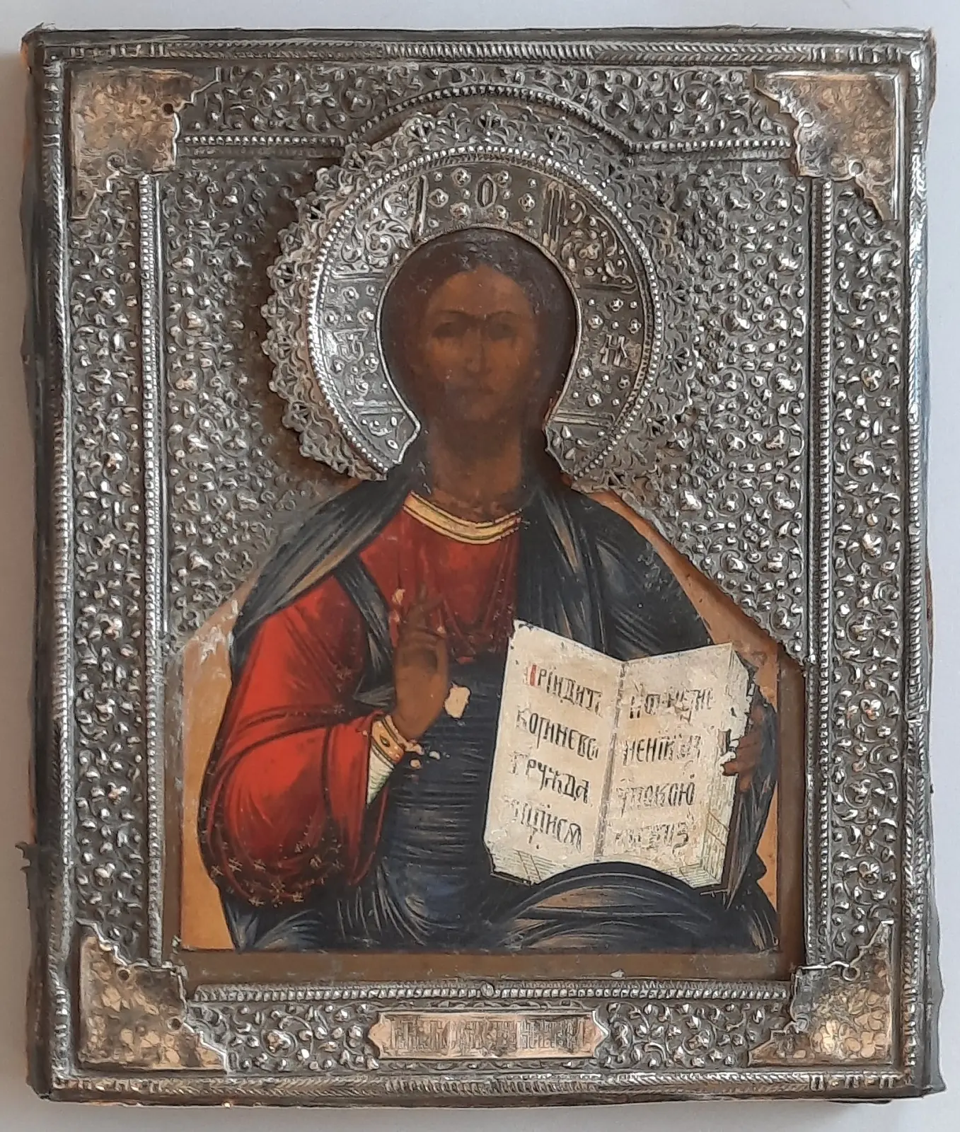 Pozycja: Ikona "Chrystus Pantokrator" w srebrnej ryzie, Rosja/Moskwa 1896 r.