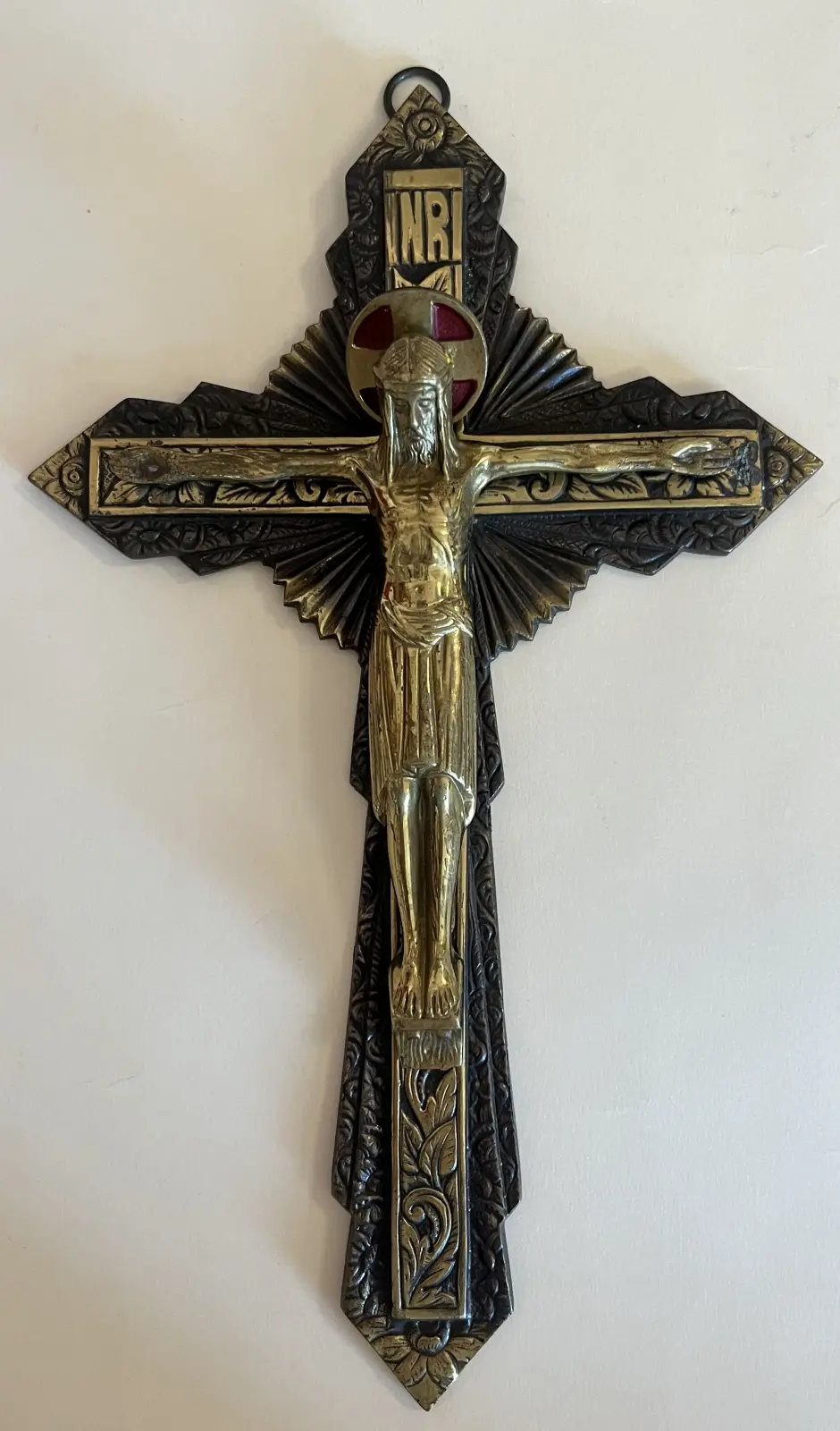 Krzyż mosiężny, wys. 29,5 cm, szer 18 cm. Francja, lata 30. XX wieku.  Z tyłu napis: "Ayez pitie de nous" (fr." Zlituj się nad nami") Stan zachowania bardzo dobry.