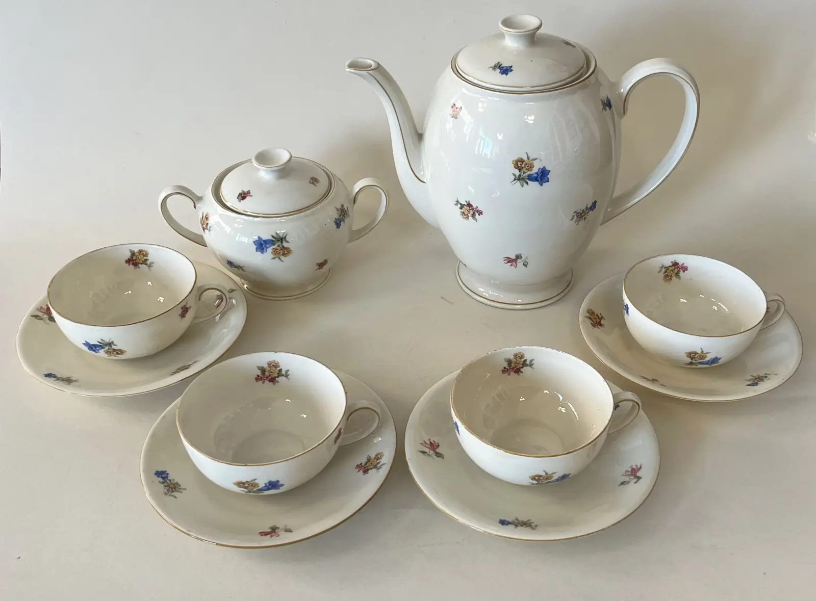 Porcelanowy serwis do herbaty wyprodukowany przez Giesche, dla czterech osób, dzbanek, cukiernica, sygnatura z lat 1935-1945, stan: brak mlecznika, drobne wyszczerbienie na krawędzi cukiernicy.