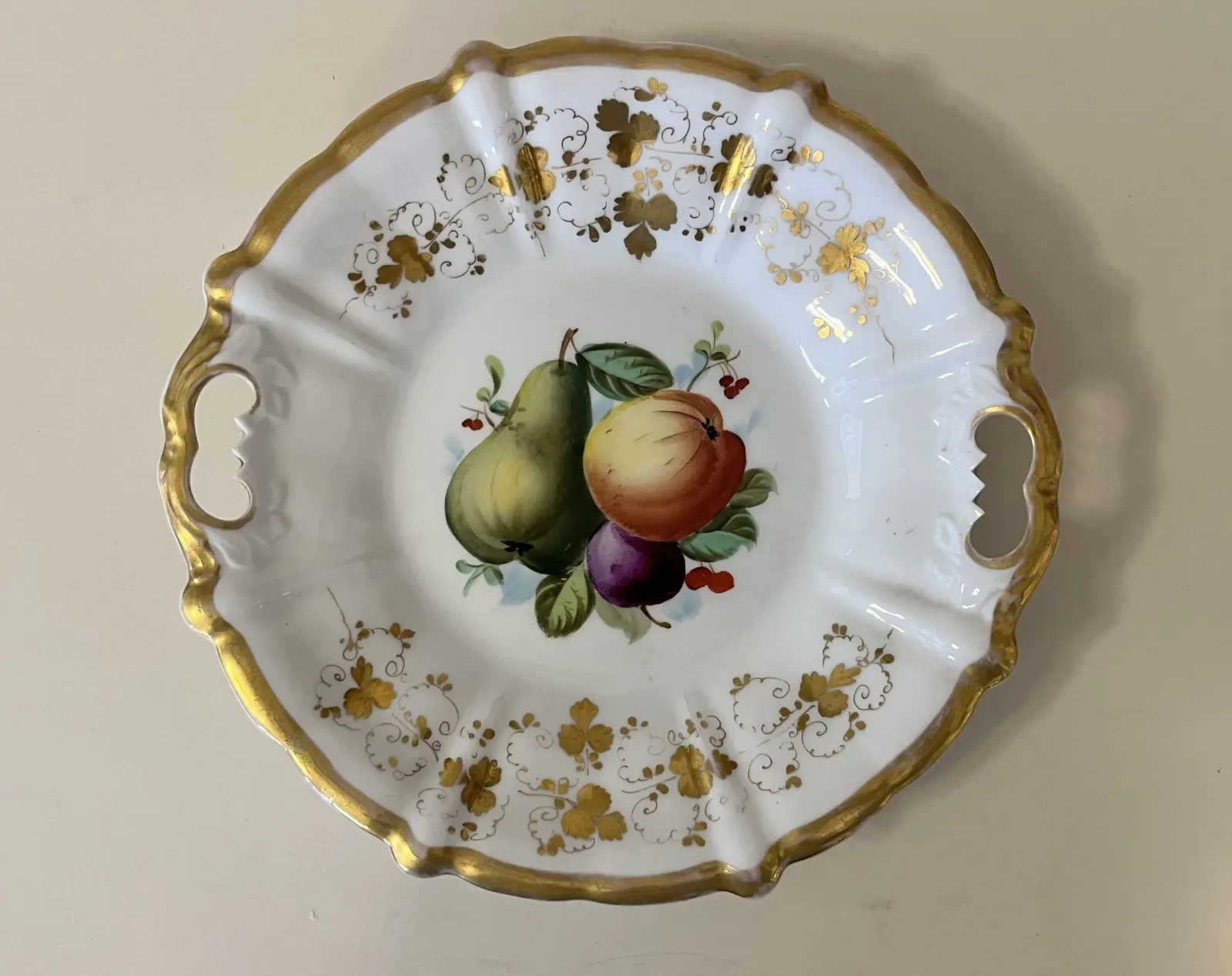 Porcelanowa patera produkcji Carl Tielsch Altwasser (Późniejszy Wałbrzych) malowana ręcznie, złocona, śr. 25 cm. Sygnatura ok. 1860 r. Stan zachowania bardzo dobry.