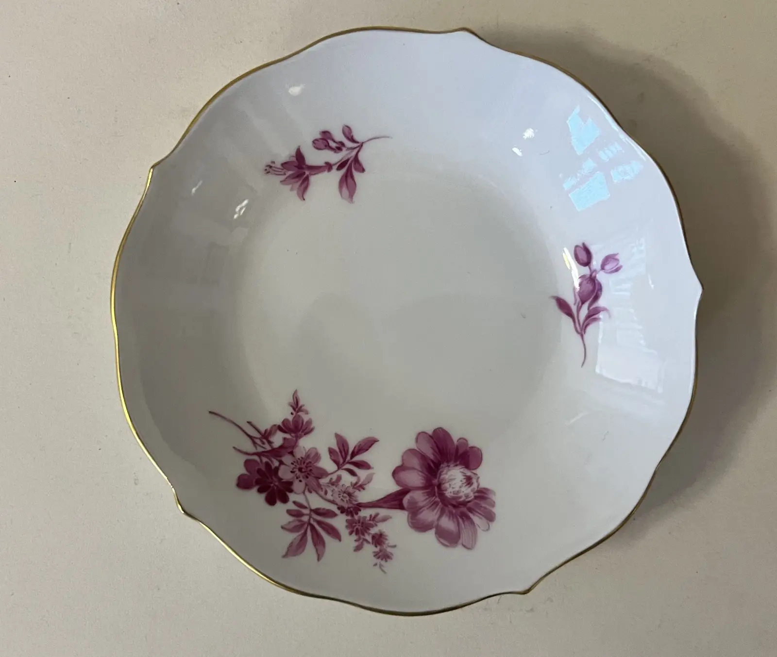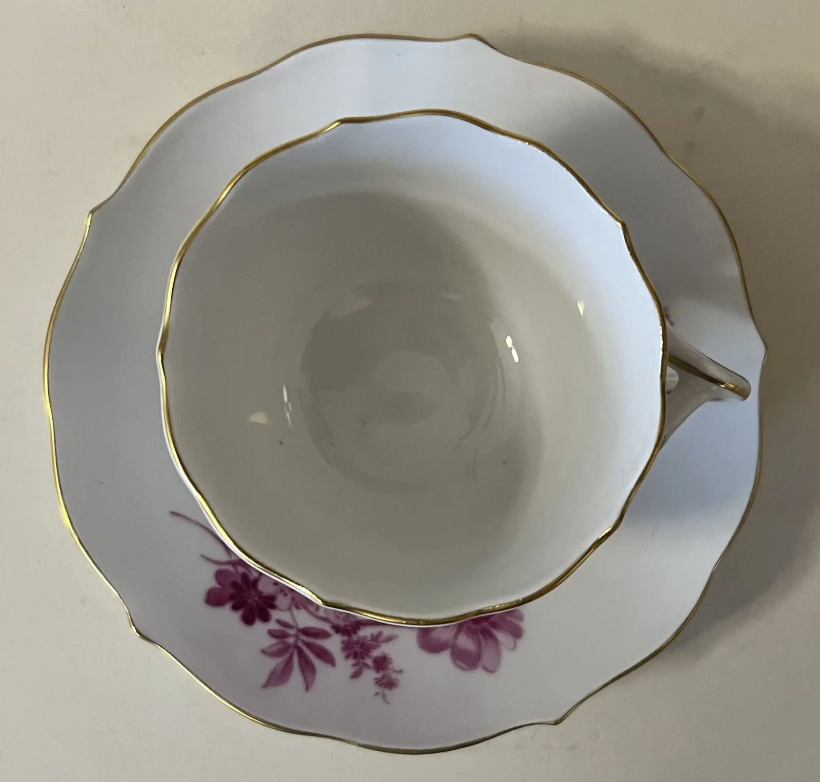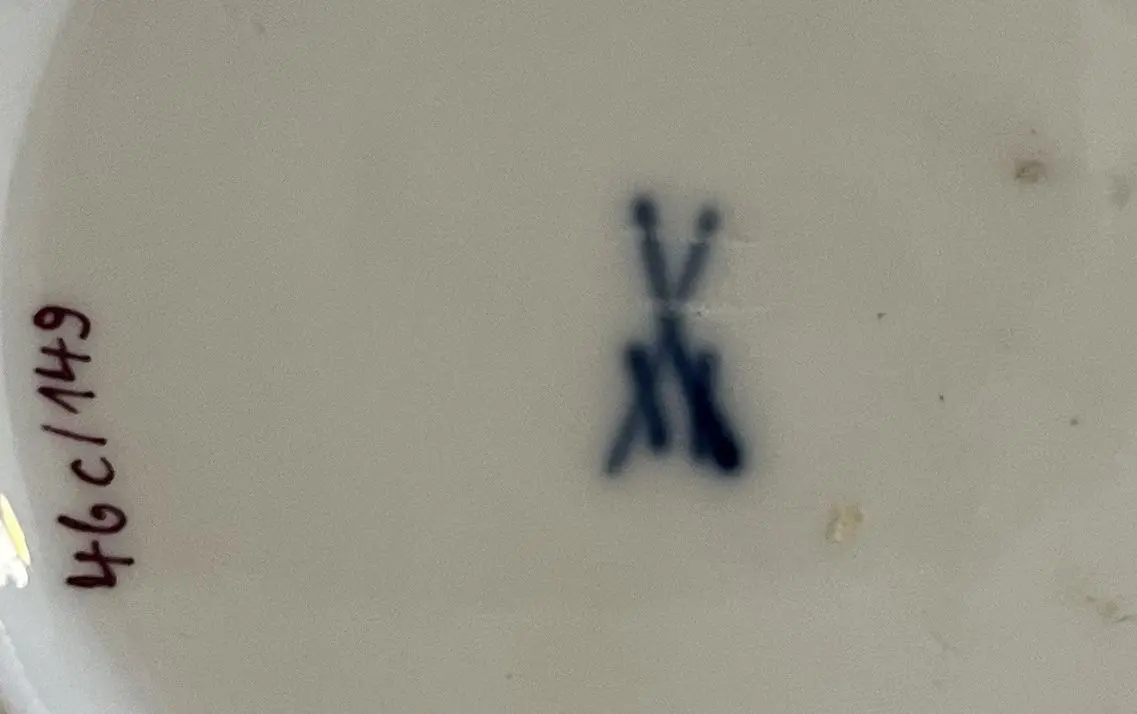 Filiżanka ze spodkiem produkcji miśnieńskiej, wys. filiżanki 5 cm, szer. spodka 11 cm. Porcelana drugiej jakości. Stan zachowania bardzo dobry.
