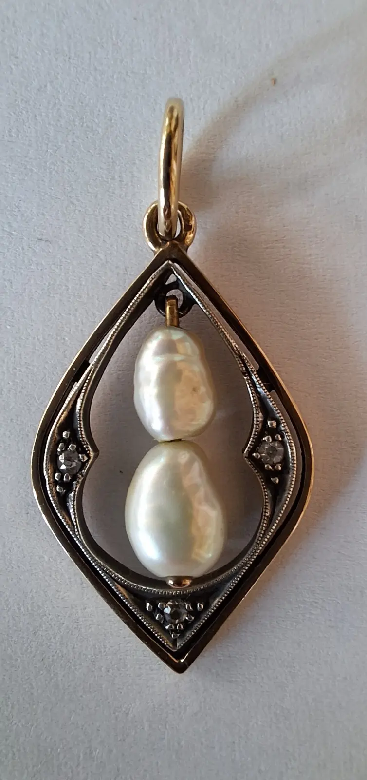 Złoto pr.3 , dwie perełki słodkowodne , trzy diamenciki ,  waga 2,7 g.