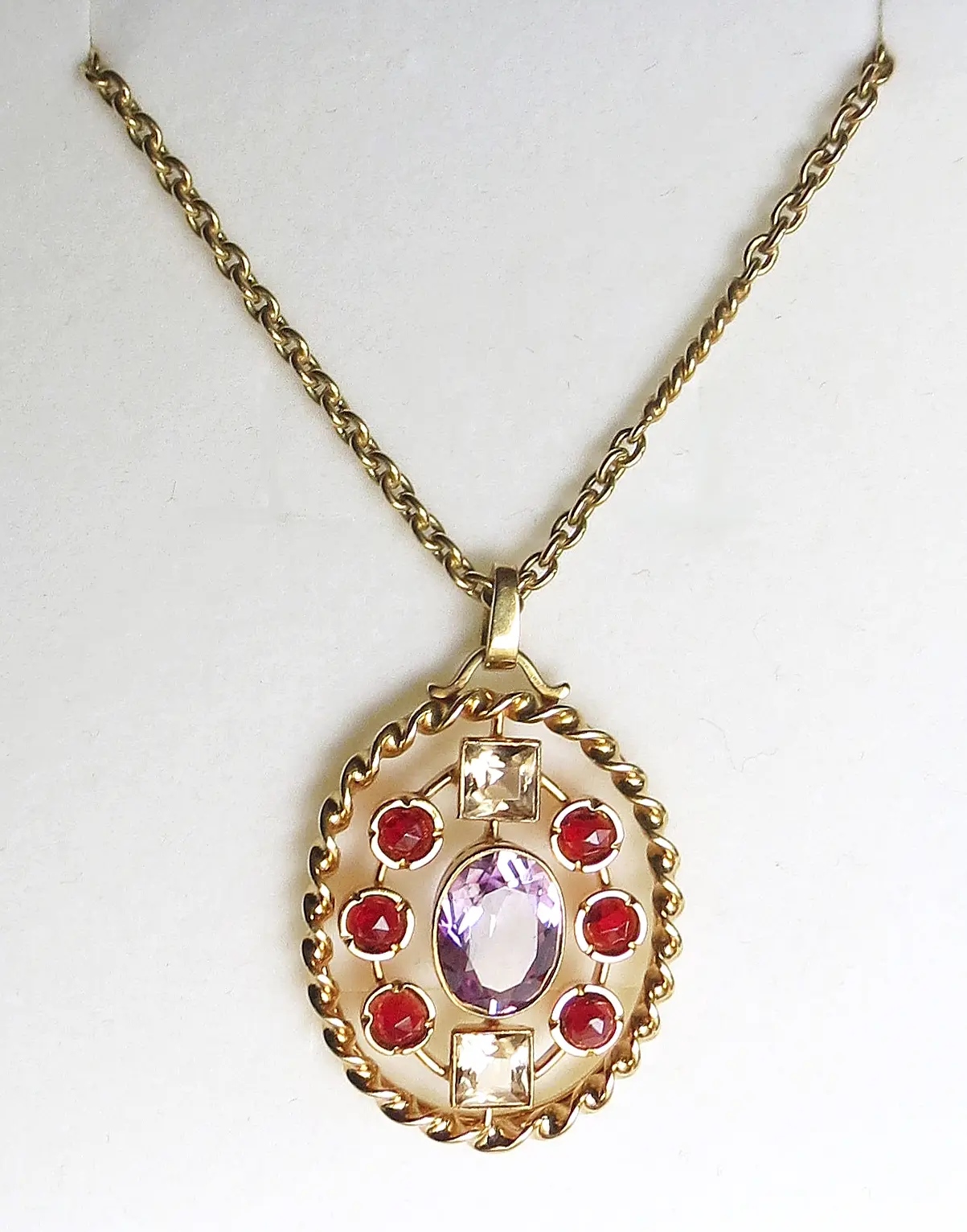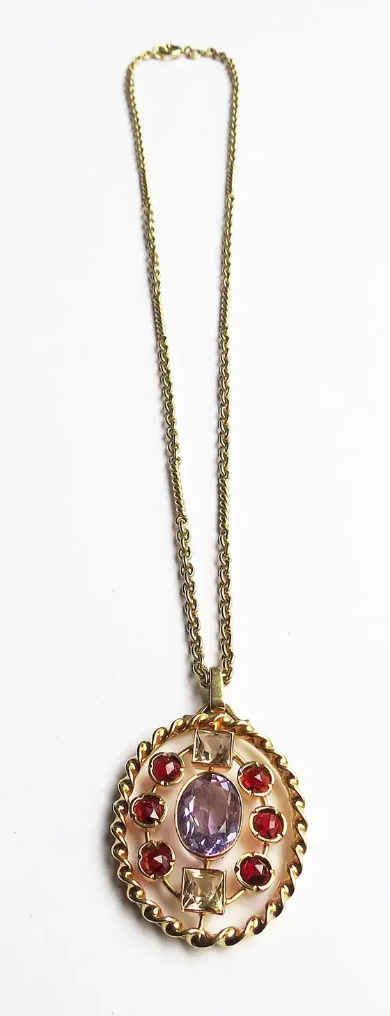 owalny ametyst o szlifie fasetowym,  masa ok. 3,20 ct, barwa jasnofioletowa,  6 granatów o kształcie okrągłym i szlifie fasetowym, masa ok. 2,00 ct, barwa ciemnoczerwona, oraz 2 cytryny o kształcie kwadratowym i szlifie fasetowym, masa ok. 1,60 ct, barwa jasnożółta; oprawa i łańcuszek żółte złoto pr. ok. 0,585,  waga 20,36 g, dł. wisiorka 4 cm, dł. z łańcuszkiem 25,5 cm.