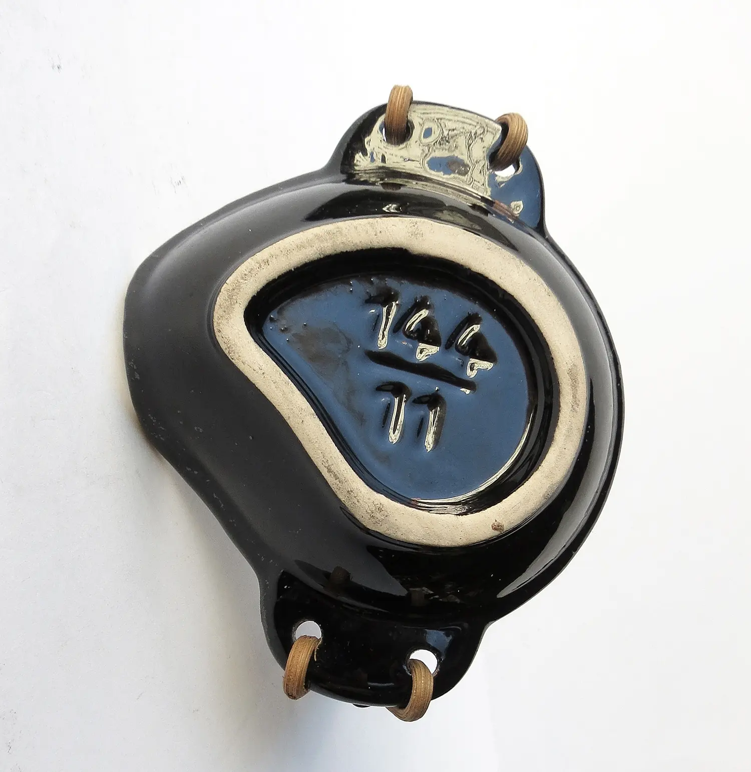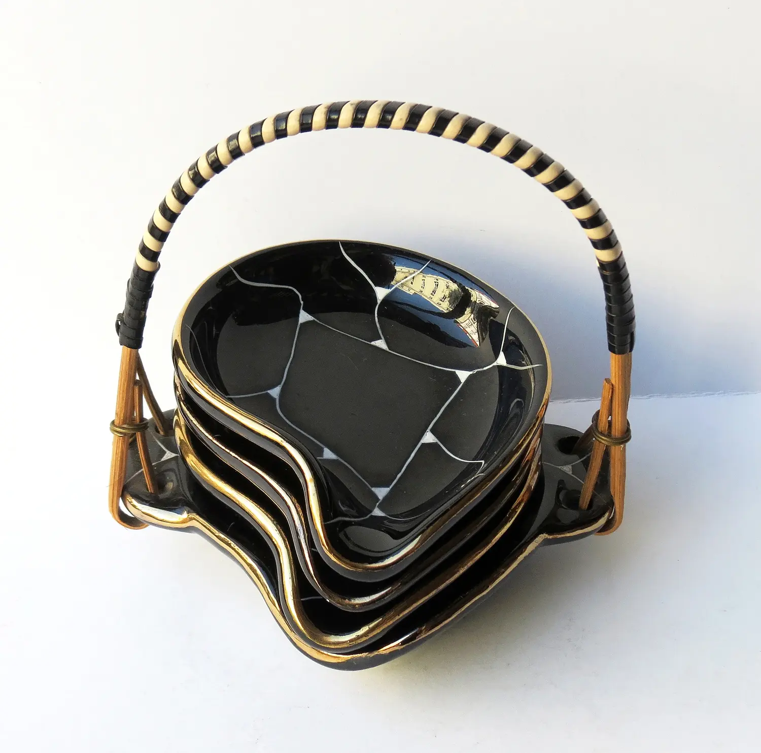 4 sztuki, jedna popielniczka z drewnianym pałąkiem; ceramika, czarne szkliwo, biała farba naszkliwna, złocenie, wym.: 10 x 8,5 cm, wys. (z pałąkiem): 11,45 cm, na spodzie wyciskany numer: 144 i 145/10. Stan dobry.