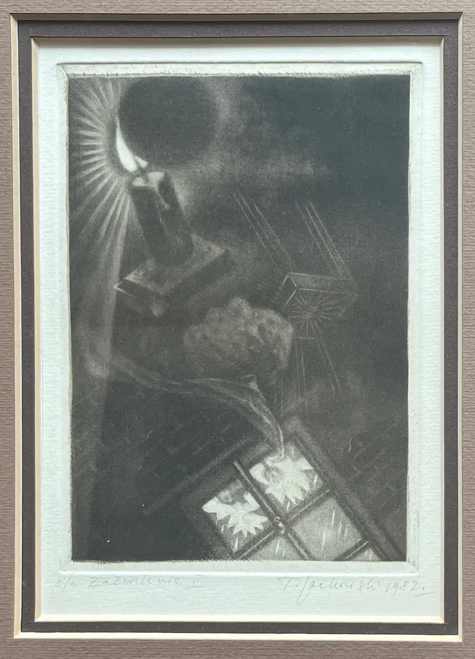 Grafika mezzotinta, odbitka autorska,  sygnowana pd. T.Jackowski 1982. Format 16,5x12 cm.