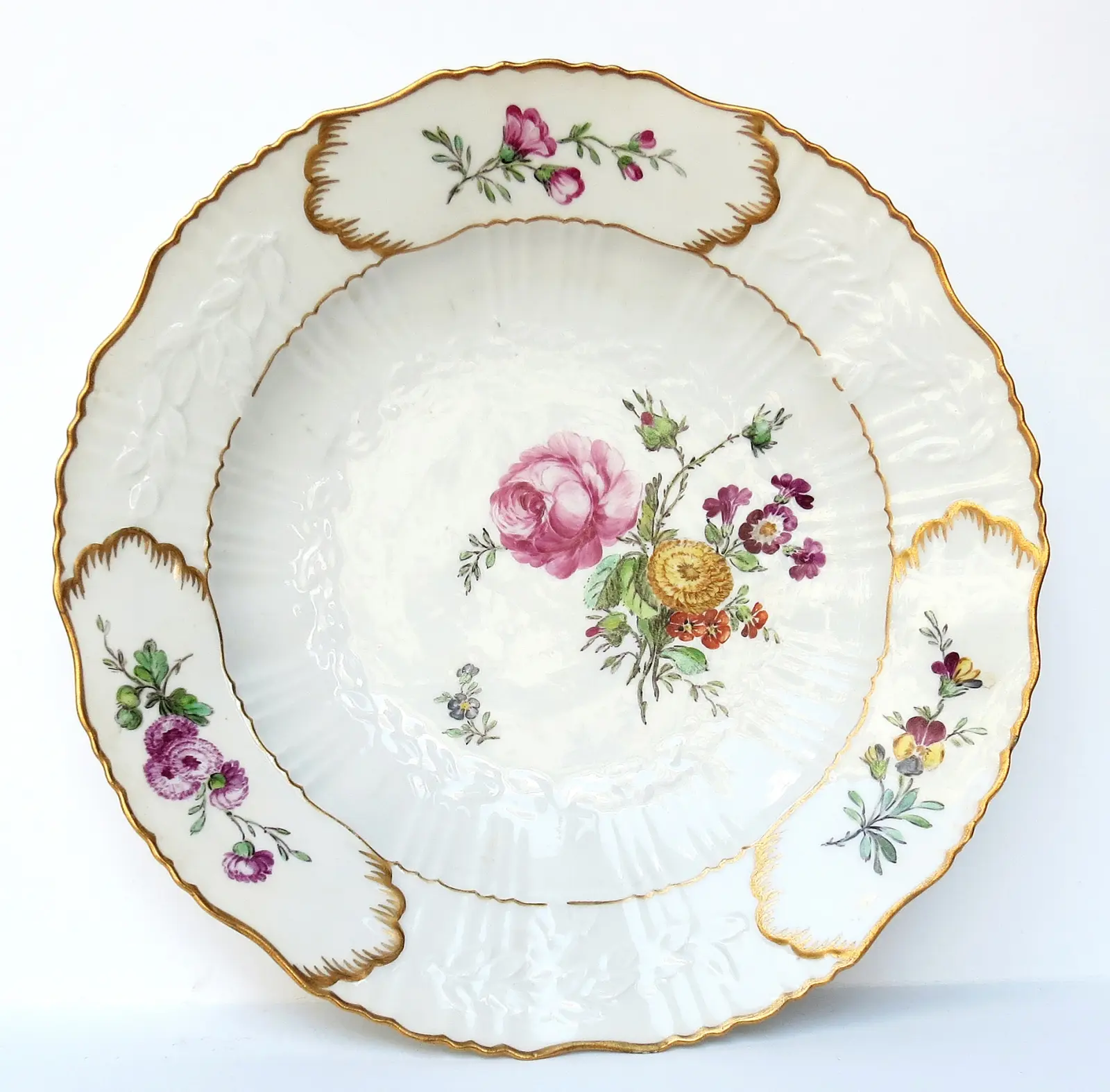 porcelana, farby naszkliwne, złocenie, śr. 24 cm; lustro i kołnierz dekorowane reliefowym motywem gałązek, w lustrze malowany bukiet barwnych kwiatów (Saksisk Blomst),  falisty kołnierz dekorowany trzema gałązkami  kwiatów; znak fabryki Royal Copenhagen Juliane Marie po 1900, czerwoną farbą monogram malarza: SO, numery zieloną farbą: 16/89, ryty numer modelu: 66. Stan zachowania dobry.