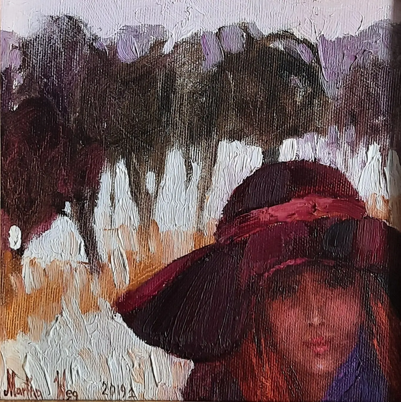 olej / płótno; sygn.l.d. 'Martta Węg 2019', wymiary: 20 x 20 cm; obraz opisany autorsko na odwrocie: 'Martta Węg / 'Przedwiośnie, spacer' / olej, płótno / 20 x 20 cm /  2019 r', oprawa listwowa, materiałowe passe-partout, 2019 r.