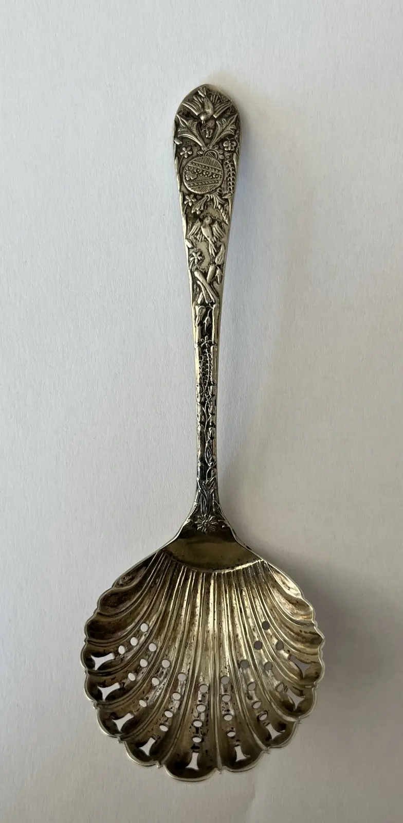 Ażurowa łyżka-sitko, dł. 14,5 cm, metal platerowany