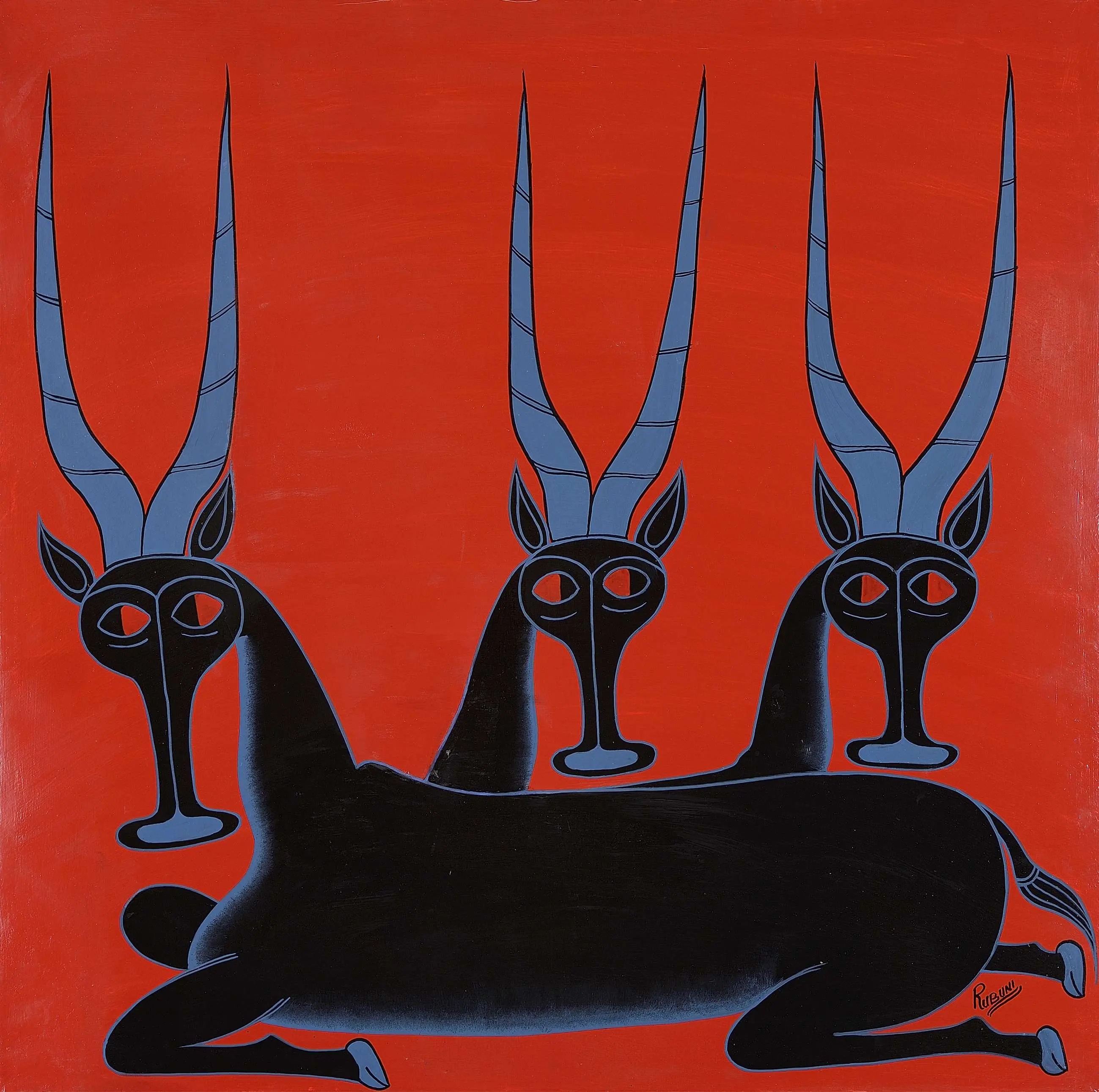 technika własna, płótno, 98 x 98 cm, sygn. p.d.: "Rubuni". Opis autorski na odwrocie: "RB", w prawym dolnym rogu naklejka "AFRICAN ART". Stan: Spękania farby na bokach obrazu.