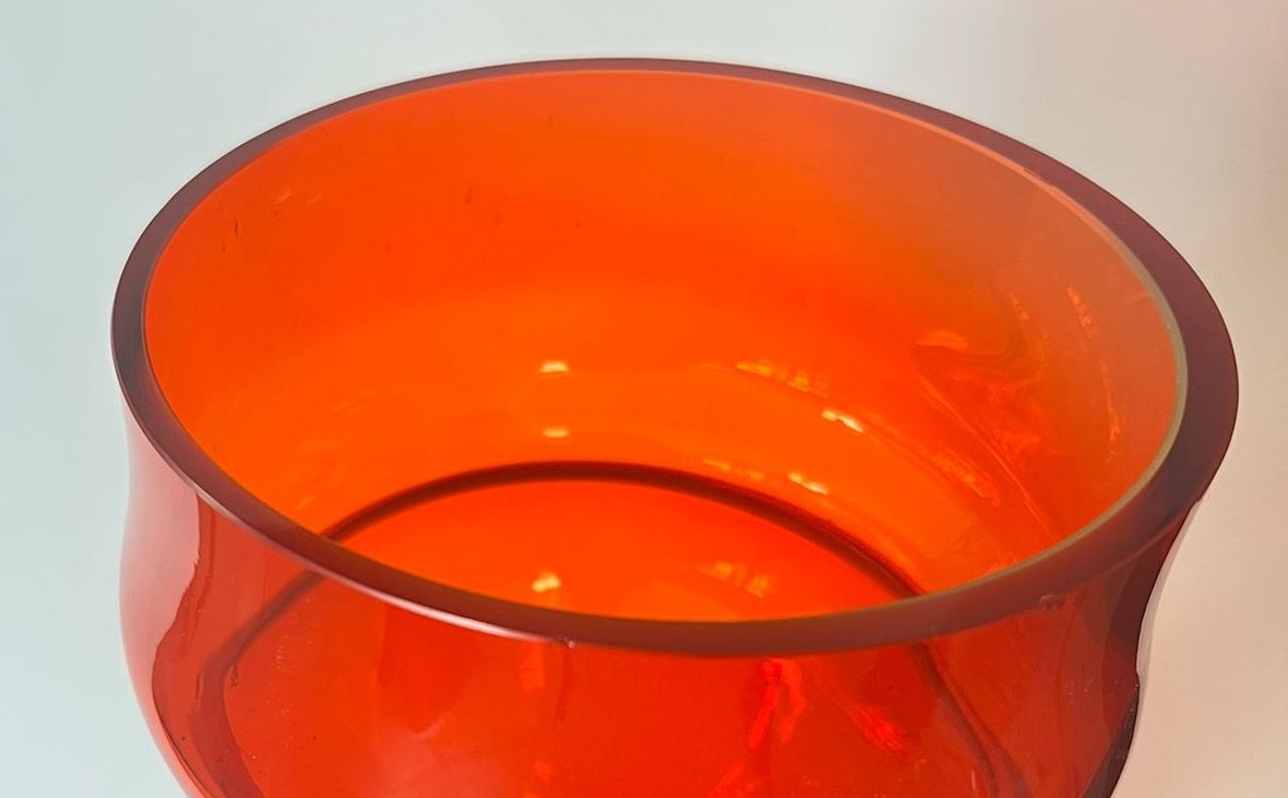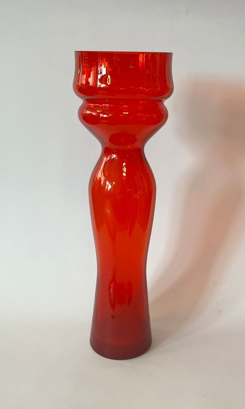Wazon szklany wyprodukowany przez hutę szkła Sudety, proj. Stefan Sadowski szkło sodowe, barwione w masie na kolor rubinowy, formowane ręcznie. Wysokość 42 cm. Drobne ubytki przy krawędzi wazonu widoczne na zdjęciu.