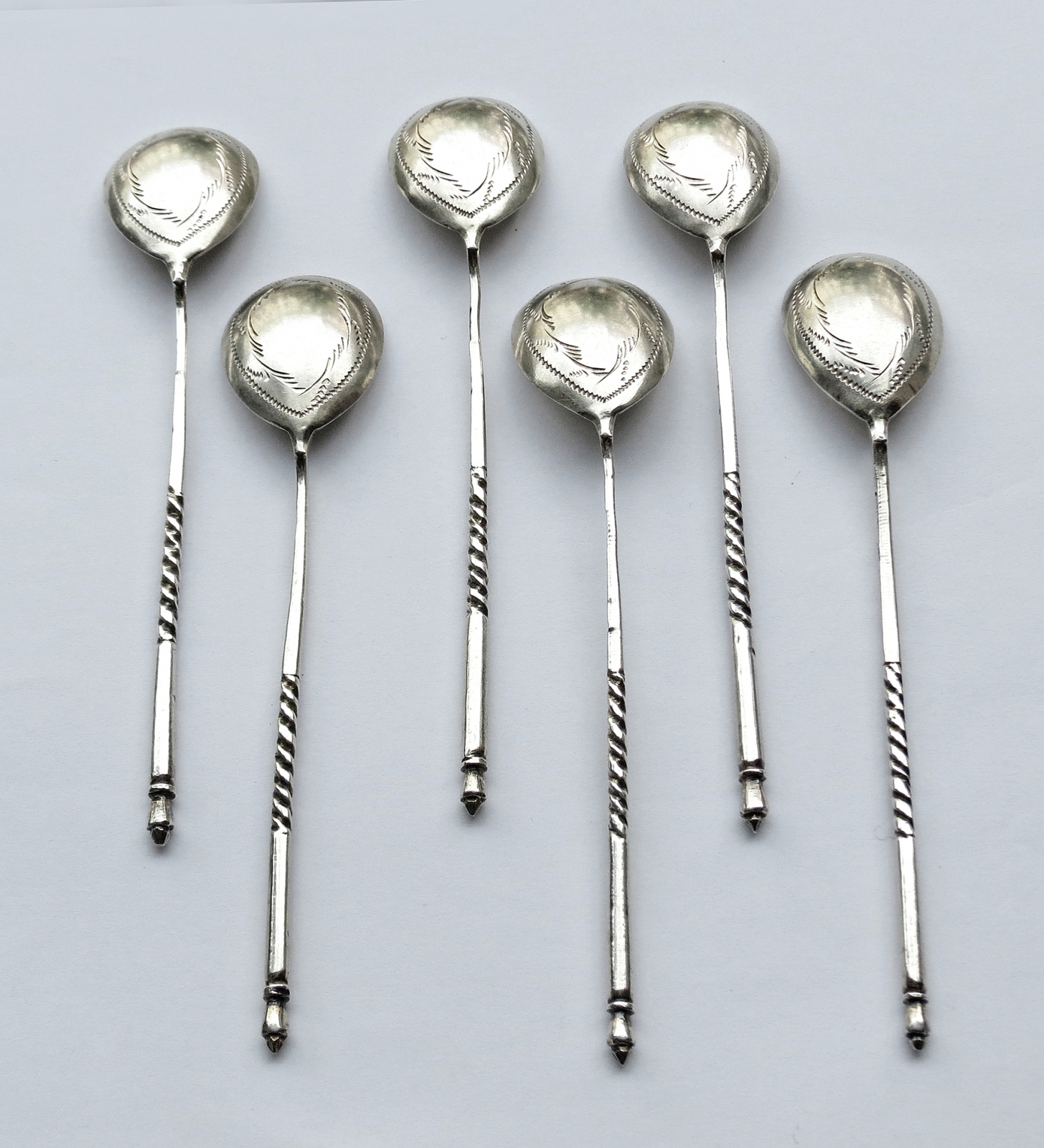 6 sztuk; nabierki dekorowane grawerowanym motywem roślinnym, trzonki częściowo kręcone; dł. 13 cm, waga 66 g, srebro  pr. 84, cechy probierni moskiewskiej  z lat 1880-1890, monogram złotnika (cyrylicą): W.A. (W. Akimow), austro-węgierska cecha wwozowa z lat 1891-1901, polska cecha dla sreber pr. 2 z lat 1963-1986. Stan zachowania: trzonki 2 łyżeczek i jedna nabierka nieznacznie wygięte.